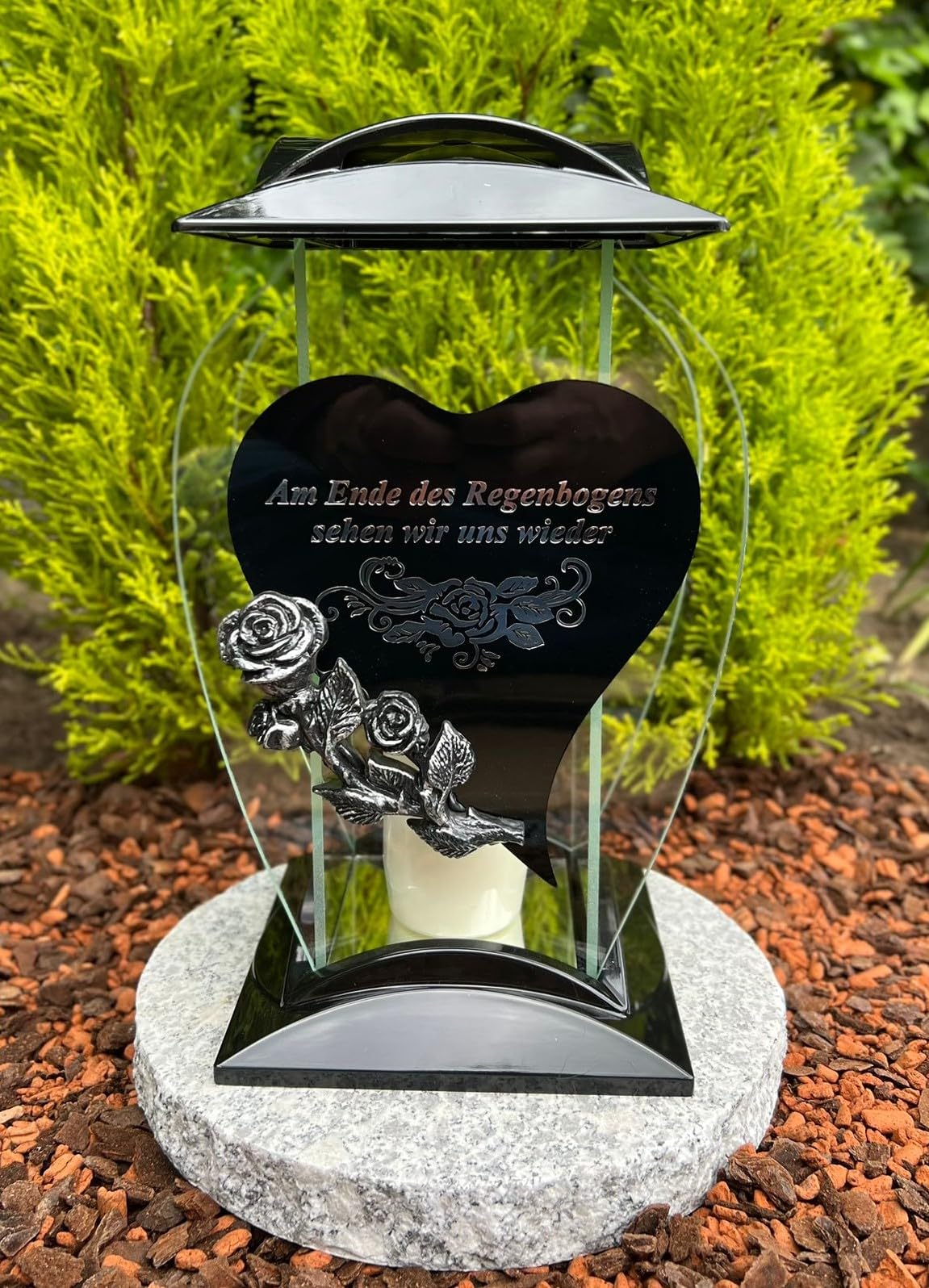 Mit der einfühlsamen Inschrift 'Am Ende des Regenbogens Sehen Wir Uns Wieder' - ein tröstlicher Gedanke für trauernde Herzen.