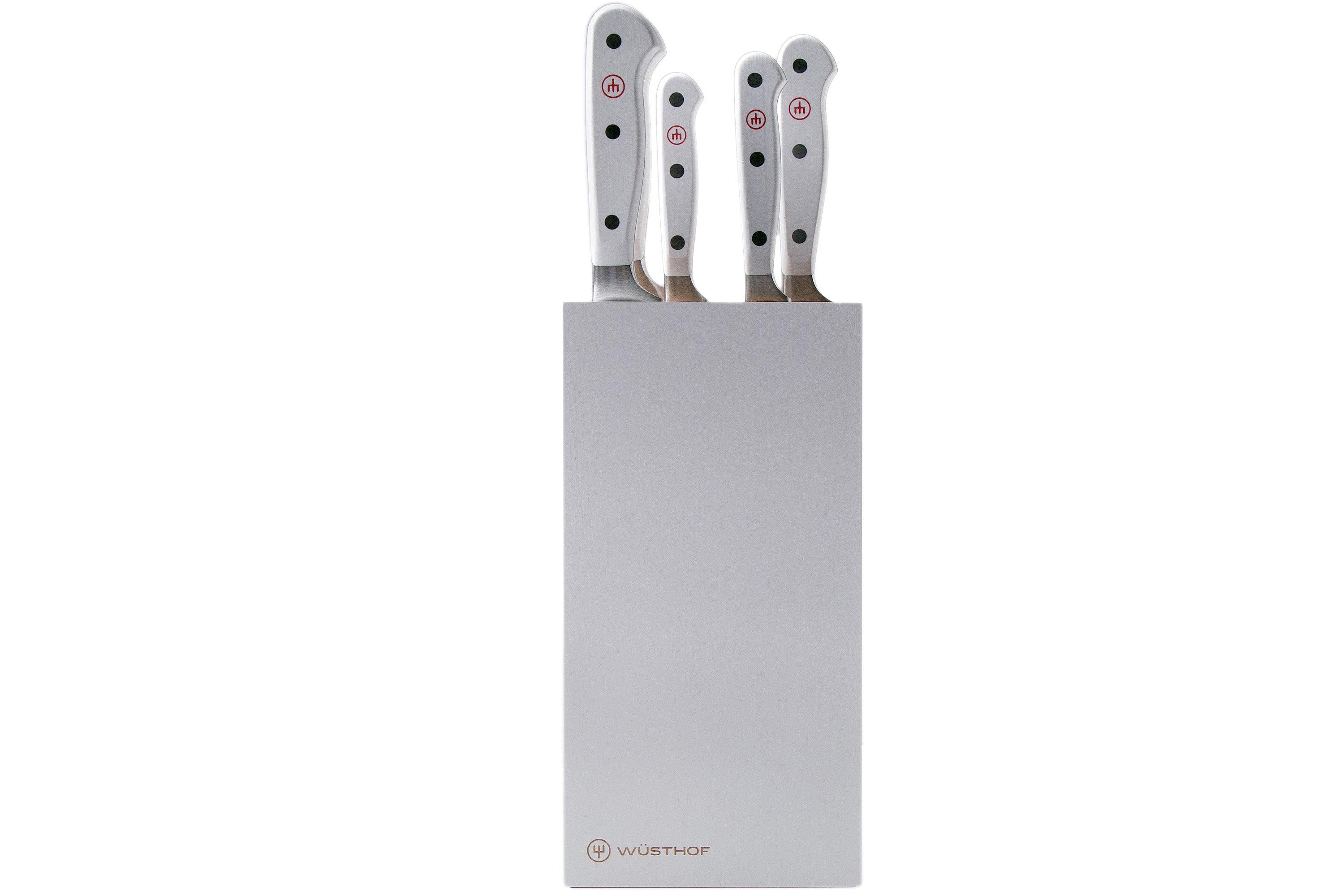 Koch-Enthusiasten aufgepasst! Dieser WÜSTHOF Messerblock in elegantem Weiß ist einfach nur traumhaft! Aus Solingen - also made in Germany mit traditioneller Handwerkskunst. Im Set sind 5 hochwertige Messer: Ein Brotmesser mit 23cm Doppel-Wellenschliff für perfekte Scheiben, ein Gemüsemesser mit 9cm Klinge für feine Arbeiten, ein Aufschnittmesser (14cm) für zarte Scheiben, ein Schinken-/Fleischmesser (16cm) und ein Kochmesser mit 20cm Klinge für die Hauptarbeit. Jedes Messer ist aus einem Stück Edelstahl geschmiedet - rostfrei und super scharf! Die weißen Griffe sind nicht nur schick sondern auch schmutzabweisend und liegen perfekt in der Hand. Der filigrane Holzblock (24,5x12,5x9cm) schützt die Messer vor Beschädigungen und sieht dabei noch total edel aus. Perfekt für Hobbyköche und Profis - oder als super Geschenk für alle die gerne kochen. Einfach bestellen und deine Küche aufwerten!