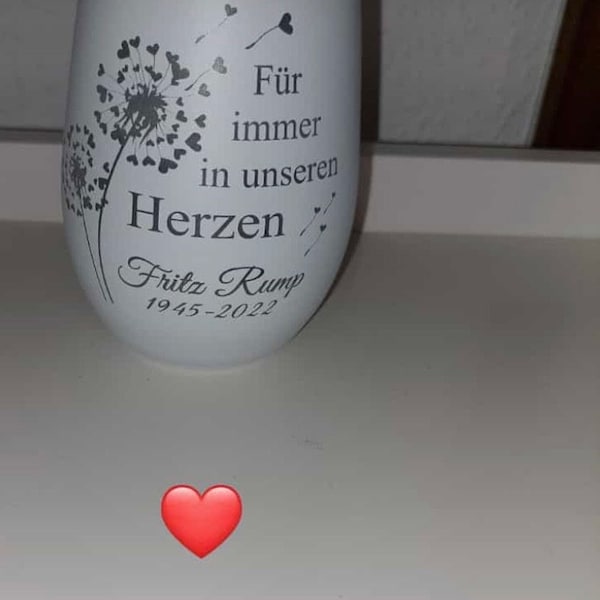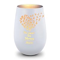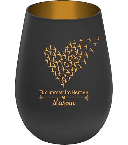 Ein stilles Andenken für besondere Menschen. Dieses Gravur-Max Windlicht spendet Trost und bewahrt Erinnerungen. Mit der persönlichen Gravur 'Für immer in meinem Herzen' und deinem Wunschname sowie Datum wird es zu etwas ganz Besonderem. Aus hochwertigem Glas, 12 cm hoch und 8,5 cm breit, mit 465 ml Fassungsvermögen für LED-Teelichter (nicht im Lieferumfang). Wählbar in verschiedenen Farbkombinationen: Außen schwarz oder weiß, innen gold, silber oder bronze. Jedes Stück wird in Deutschland mit Liebe zum Detail per Lasergravur personalisiert - ein echtes Unikat. Für eine würdevolle Atmosphäre des Gedenkens.