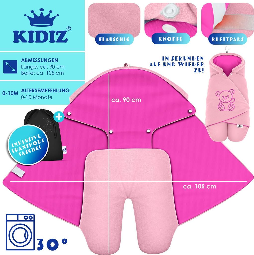 Dein Baby friert nie wieder! Diese KIDIZ Einschlagdecke hält dein Kind kuschelig warm - egal wie kalt es draußen ist.\n\nTechnische Daten:\n• Maße: 90x105cm\n• Material: 100% Polyester\n• Altersempfehlung: 0-10 Monate\n• Waschbar bei 30°C\n• Inklusive Transporttasche\n\nBesonderheiten:\n• Mit Kapuze und Kordelzug\n• Getrennter Beinbereich\n• Klettverschlüsse und Knöpfe\n• Für 3- und 5-Punkt-Gurte\n• Öffnungen für Hände\n\nKompatibel mit:\n• Maxi-Cosi Babyschalen\n• Römer Kindersitze\n• Kinderwagen und Buggys\n• Babytragen und Manduca\n• Fahrradanhänger\n\nWarum diese Decke?\n• Innovatives Faltsystem - Baby kann sich nicht befreien\n• Flauschig weich auf der Haut\n• Isoliert gegen Wind, Nässe und Kälte\n• Einfach zu öffnen zum Wickeln\n• Mit praktischer Transporttasche\n\nVorteile für Eltern:\n• Schnelles An- und Ablegen\n• Baby bleibt sicher eingepackt\n• Kein lästiges Einpacken mit mehreren Decken\n• Passt zu den meisten Systemen\n• Hochwertige Verarbeitung\n\nPerfekt für:\n• Kalte Wintertage\n• Windiges Herbstwetter\n• Frühmorgendliche Spaziergänge\n• Autofahrten im Winter\n• Besorgungen in der kalten Jahreszeit\n\nMach jeden Ausflug zum kuscheligen Erlebnis - dein Baby wird es dir danken!