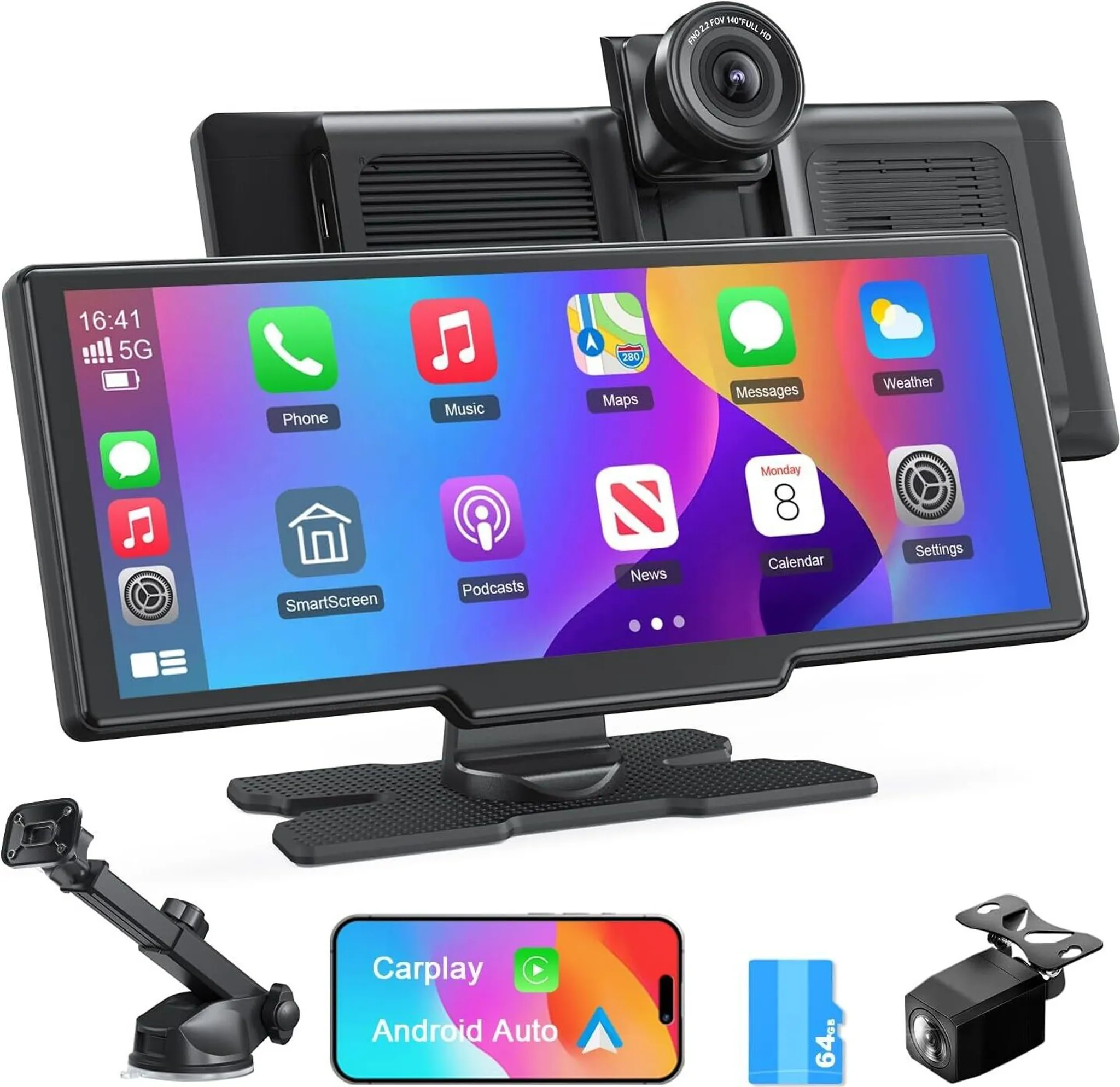Wow, was für ein Upgrade für dein Auto! Dieser 10,26 Zoll große Bildschirm bringt modernste Technik in jedes Fahrzeug. Kabelloses CarPlay und Android Auto - einfach mit deinem Smartphone verbinden und schon kannst du Navigation, Musik und Anrufe nutzen. Mit integrierter Dashcam in 4K Qualität und 1080P Rückfahrkamera für mehr Sicherheit. Der IPS-Touchscreen mit 1600*600 Auflösung ist super scharf und von allen Seiten gut ablesbar. Drei Audio-Optionen: eingebauter Lautsprecher, AUX oder FM-Übertragung. Einfache Installation per Saugnapf oder Halterung, passt in alle Fahrzeuge von 7-32V. Sprachsteuerung, Bluetooth, Mirror Link - dieses Teil kann einfach alles! Mach dein Auto smart, ohne teure Werkstattkosten.
