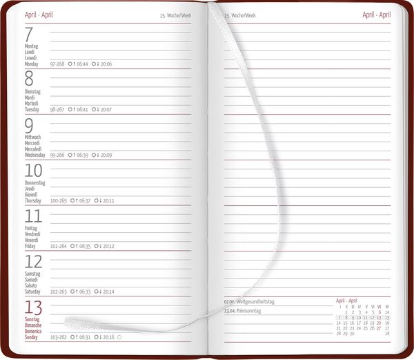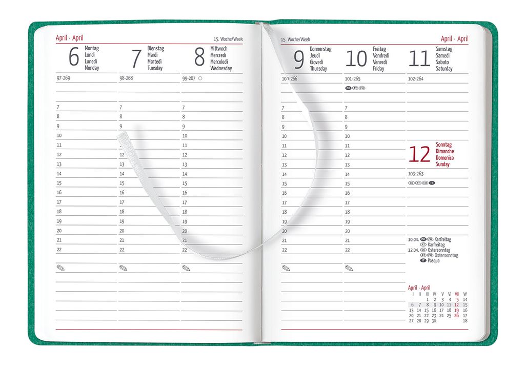 Der perfekte Begleiter für 2026! Dieser süße Taschenkalender im handlichen A6-Format (10,7 x 15,2 cm) passt in jede Handtasche. Mit seinem floralen Design und dem umweltfreundlichen Strukturpapier ist er nicht nur hübsch anzusehen, sondern auch nachhaltig. Das Kalendarium ist viersprachig (DE/FR/IT/GB) und zeigt Feiertage für Deutschland, Österreich, Schweiz, Frankreich und Italien. Pro Woche gibt's eine Doppelseite mit Zeiteinteilung von 7-22 Uhr plus Platz für Notizen. Mit Leseband, Monatsübersichten und abgerundeten Ecken - einfach praktisch!