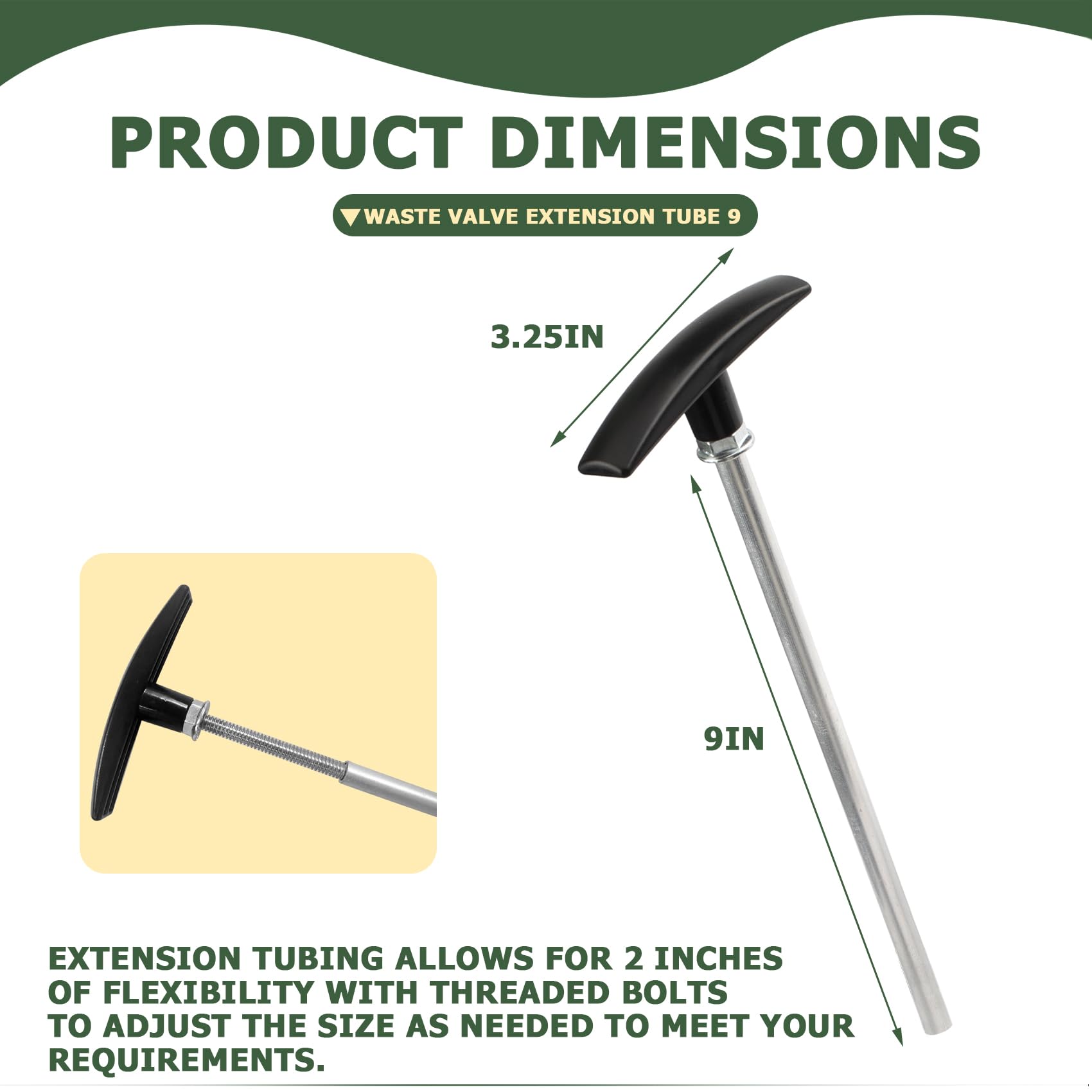 Praktisch für jedes Wohnmobil! Dieses Set mit 2 Paar Verlängerungsstangen (6 und 9 Zoll) macht das Entleeren des Abwassertanks viel einfacher. Kein Bücken mehr! Einfach zu installieren, keine Werkzeuge nötig. Aus langlebigen Materialien, hält auch bei häufigem Gebrauch. Ein absolutes Must-Have für jeden Camping-Ausflug. Mach dir das Leben leichter - bestell dieses praktische Set!