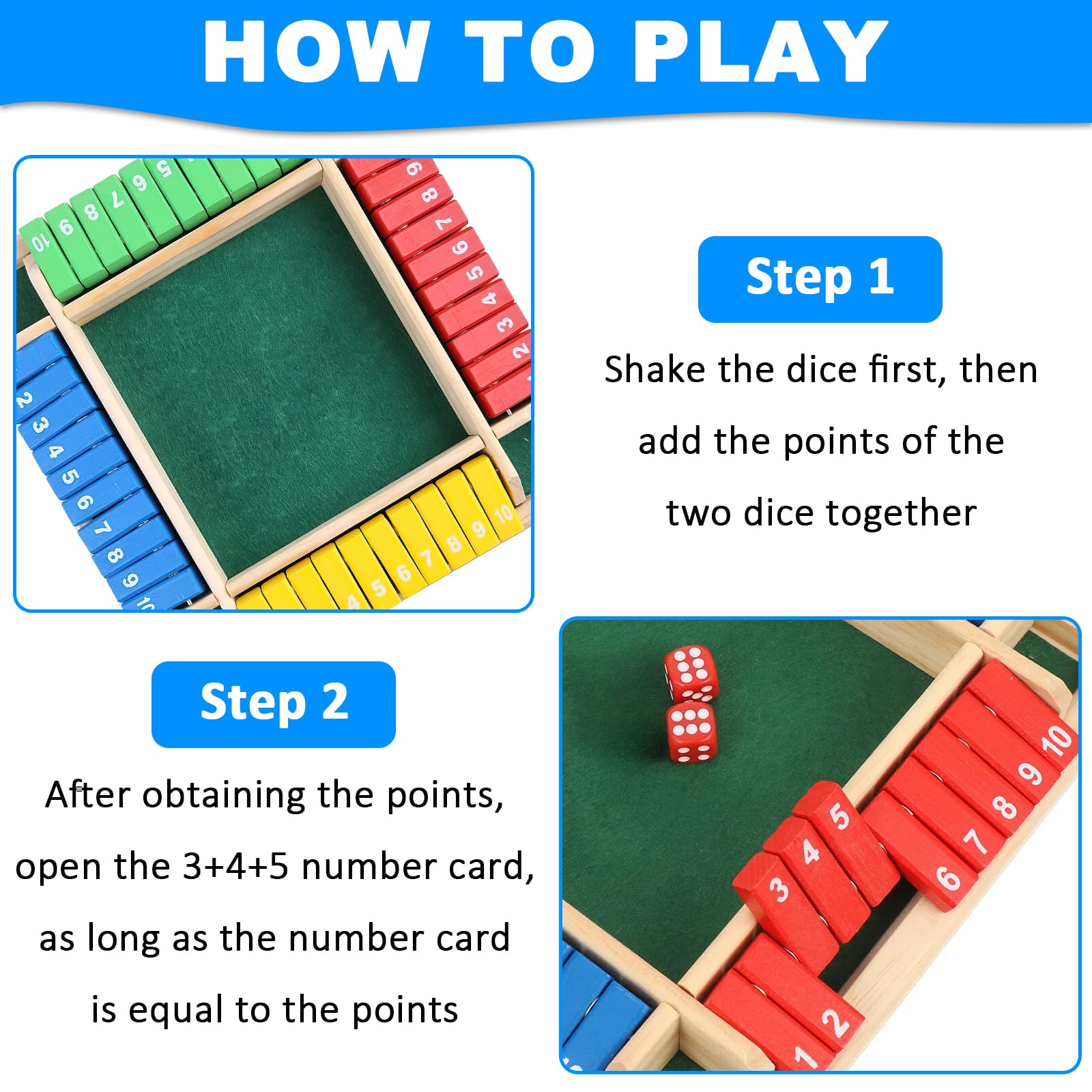 Spaß mit Zahlen für die ganze Familie! Shut The Box ist das perfekte Würfelspiel für 2-4 Spieler. Aus hochwertigem Holz gefertigt, mit filzbezogener Unterseite für ruhiges Spielen. Fördert spielerisch Mathefähigkeiten und logisches Denken - ideal für Kinder ab 3 Jahren. Einfache Regeln, aber voller strategischer Möglichkeiten. Perfekt für Familienabende, Reisen oder Partys. Maße: 22x22x3.5cm - kompakt und überall mitnehmbar. Lernspaß, der nie langweilig wird!