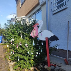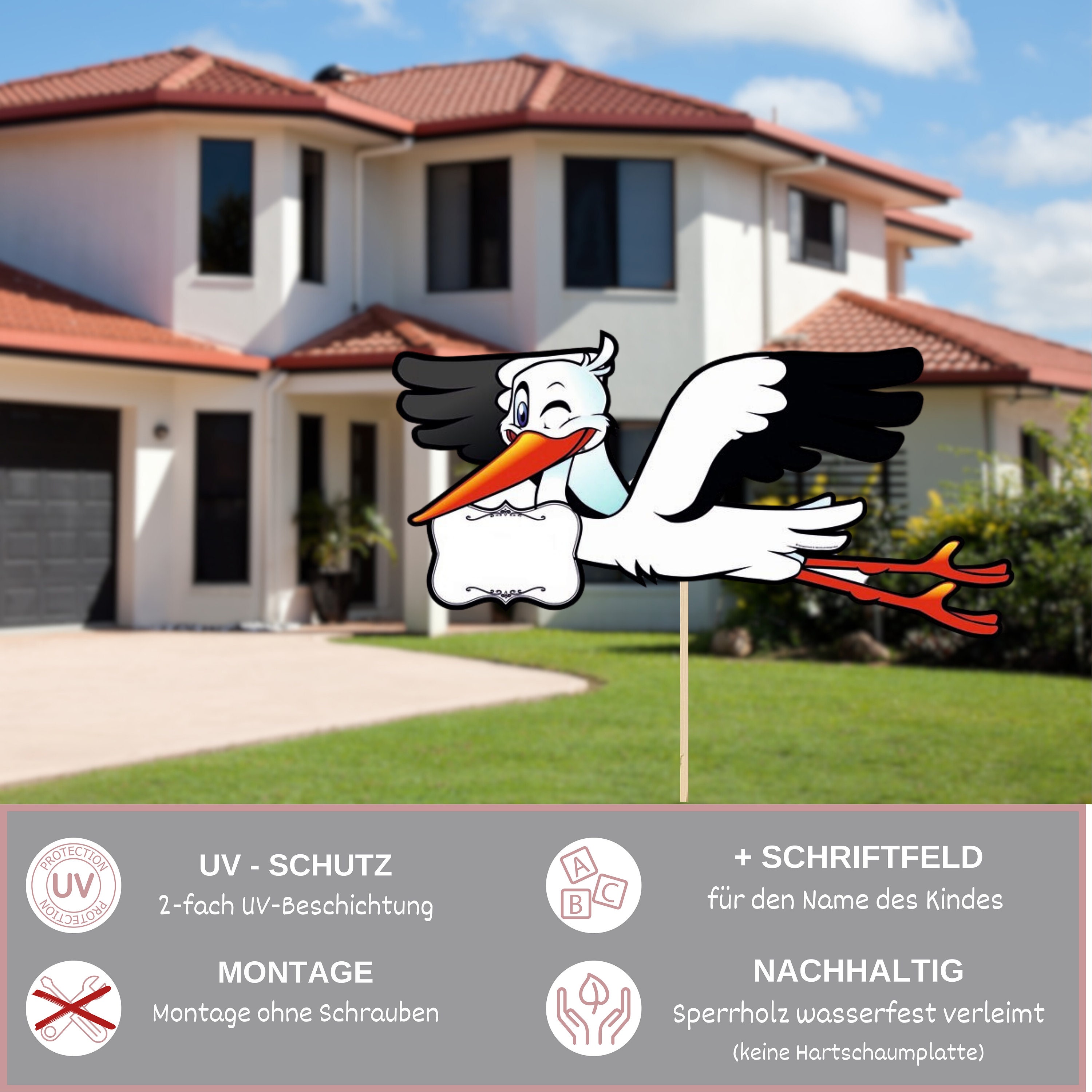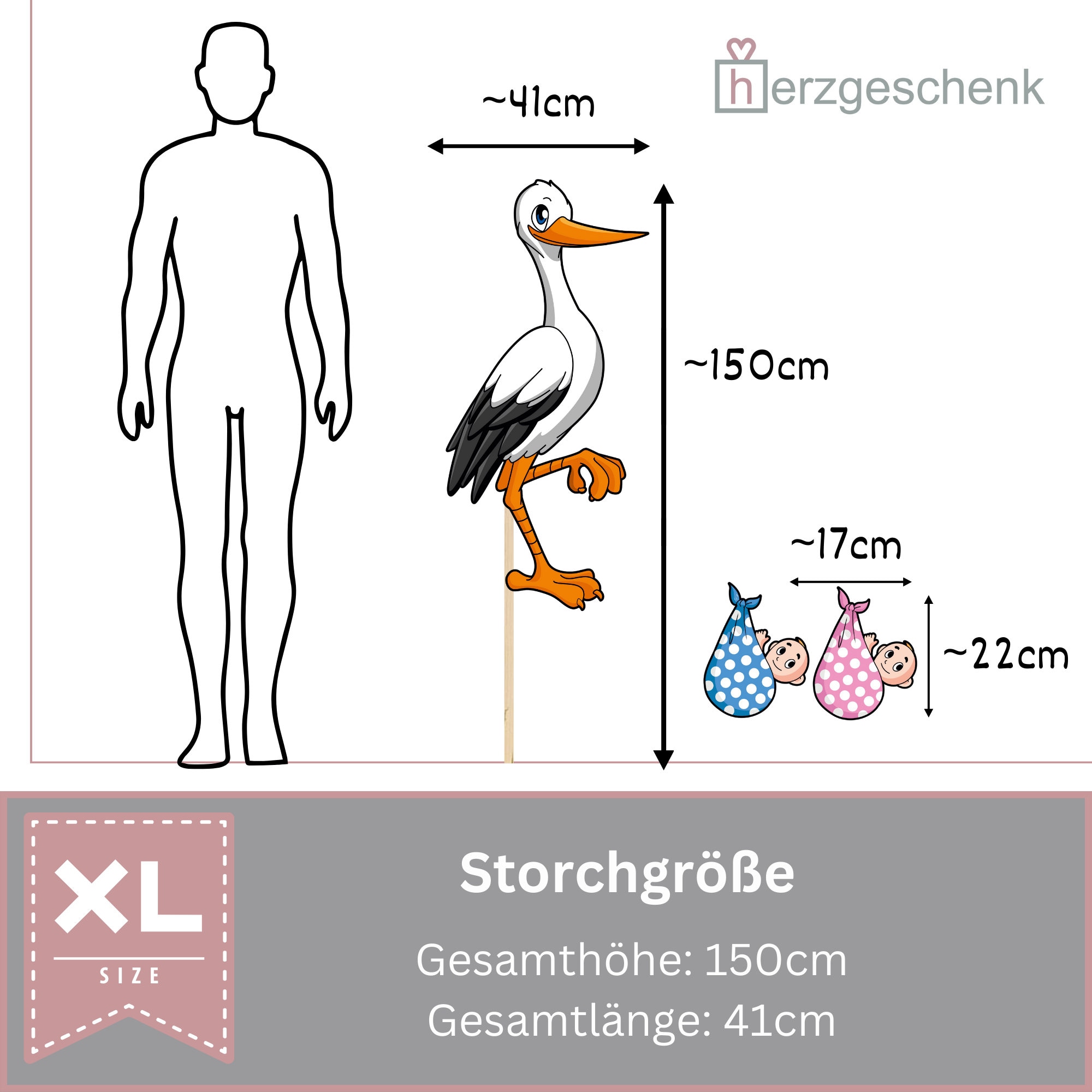 Der klassische Klapperstorch - jetzt in extra großer XL-Version! Mit stolzen 55cm Höhe und 45cm Breite ist dieser Holzstorch ein echter Hingucker in jedem Garten, auf dem Balkon oder im Kinderzimmer. Aus stabilem, lackiertem Holz das beidseitig bemalt ist - also von allen Seiten schön anzusehen. Der abnehmbare Gartenspieß macht ihn vielseitig einsetzbar: Einstecken im Garten oder einfach als Deko-Objekt im Haus. Perfekt zur Geburtsanzeige, als Geschenk zur Taufe, Hochzeit oder zum Polterabend. Inklusive blauem und rotem Dekoband für den Schnabel - traditionell für Jungen oder Mädchen. Besonders toll: Du kannst ihn sogar personalisieren lassen mit dem Wunschnamen des Kindes! Einfach den entsprechenden Artikel mitbestellen. Wetterfest und wasserfest lackiert - hält also auch draußen problemlos. Ein zeitlos schönes Stück Tradition, das Generationen überdauert. Mach deinem Nachwuchs oder jungen Eltern eine Freude mit diesem charmanten Storch - er wird sicher zum Lieblingsstück in der Deko!