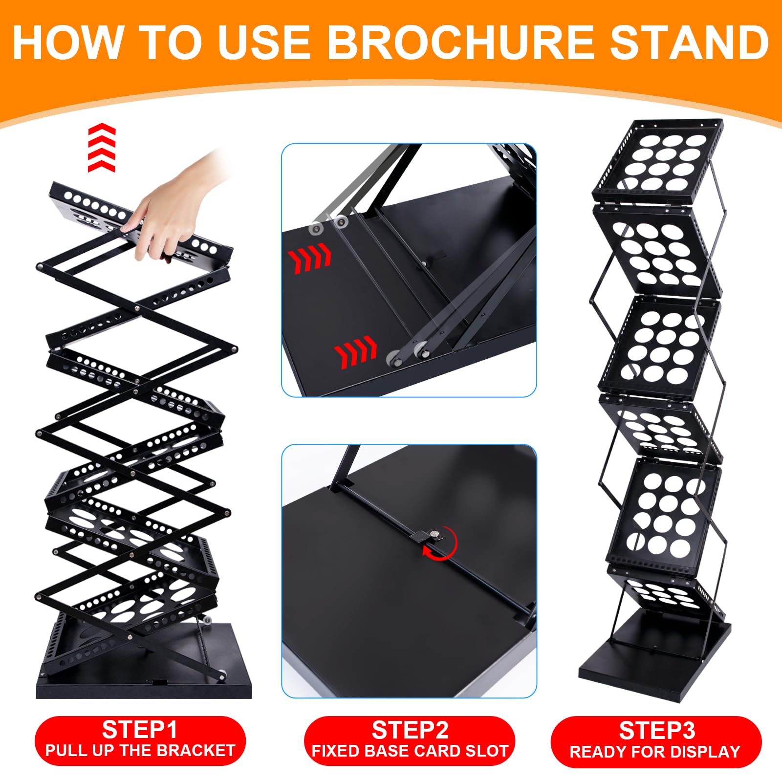 Ordnung fürs Büro! Dieser faltbare Prospektständer hat 5 Etagen und bietet reichlich Platz für Flyer, Zeitschriften und Prospekte im A4-Format. Aus robustem Eisen mit schwarzer Beschichtung - rostfrei und langlebig. Die geneigten Fächer mit seitlichen Begrenzungen halten alles sicher an Ort und Stelle. Die gelochten Platten sorgen für gute Belüftung - keine schimmligen Dokumente! Maße: 40x27x160cm, jede Ebene hält bis 5kg. Super stabil durch L-Form und rutschfeste Füße. Wenn nicht gebraucht, einfach zusammenklappen und platzsparend verstauen. Perfekt für Empfang, Wartezimmer, Messen oder Büro. Montage nicht nötig - sofort einsatzbereit!