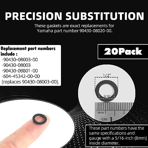 Nie wieder undichte Ölablassschrauben! Dieses 20er-Pack Ersatzdichtungen passt für die meisten Yamaha 4-Takt Außenbordmotoren und ersetzt die Originalteile 90430-08020-00 und 90430-08003-00. Aus japanischer Hartfaser gefertigt, sind diese schwarzen Dichtungen besonders widerstandsfähig gegen Öl und Wasser. Mit 8mm Innendurchmesser sitzen sie perfekt und verhindern zuverlässig lästige Öllecks. Da man diese kleinen Teile so leicht verliert, ist es praktisch, immer ein paar auf Vorrat zu haben. Kompatibel mit vielen Modellen - von 2,5 PS bis 300 PS. Einfach die alte Dichtung entfernen, neue aufsetzen und das untere Getriebeöl kann problemlos gewechselt werden. Zuverlässige Qualität, die sogar die OEM-Spezifikationen übertrifft - damit dein Außenborder immer einsatzbereit ist!