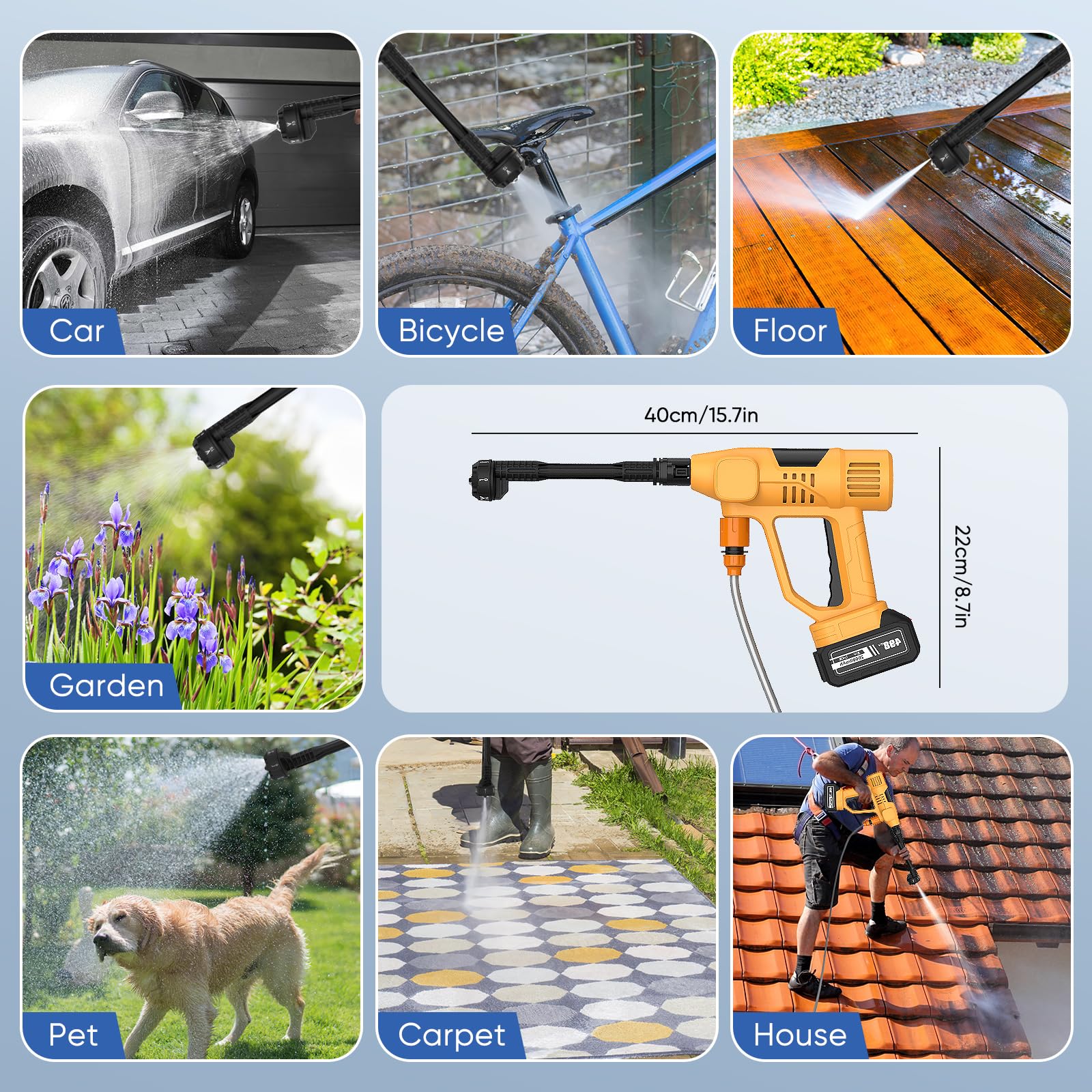 Sauber machen war noch nie so einfach! 💦 Dieser kabellose Hochdruckreiniger von Ykall gibt dir absolute Freiheit - ohne lästige Kabel oder Steckdosen in der Nähe.\n\nMit zwei starken 4A-Akkus hast du immer genug Power:\n• 25-30 Minuten Betrieb bei voller Leistung\n• Bis zu 40 Minuten im Sparmodus\n• Schnellladung in nur 3-4 Stunden\n• 30% mehr Kapazität als vergleichbare Modelle\n\n🎯 Die geniale 6-in-1 Düse bietet dir:\n• 0°-Strahl für hartnäckige Verschmutzungen\n• 15°, 25°, 40° für verschiedene Flächen\n• Strahlmodus für maximale Reinigungskraft\n• Duschmodus für sanfte Bewässerung\n\nDer 5 Meter lange Schlauch mit Filter saugt Wasser aus Eimern, Pools oder Bächen (bis 1,5m Höhe). Perfekt für unterwegs!\n\nEinsatzmöglichkeiten ohne Ende:\n• Auto waschen und enteisen\n• Terrasse und Gartenmöbel reinigen\n• Fahrräder und Motorräder säubern\n• Pflanzen bewässern\n• Beim Camping und im Wohnmobil\n• Poolreinigung\n• Haustiere duschen (sanfter Modus!)\n\n🚫 Wichtig: Kein Salzwasser verwenden - verursacht Korrosion!\n\nIm Komplett-Set enthalten: 2 Akkus, Ladegerät, 6-in-1 Düse, 5m Schlauch, Filter, Schaumbehälter, Aufbewahrungsbox und mehr.\n\nLeicht, tragbar und sofort einsatzbereit - dein perfekter Begleiter für Haus, Garten und Reisen! 🌟