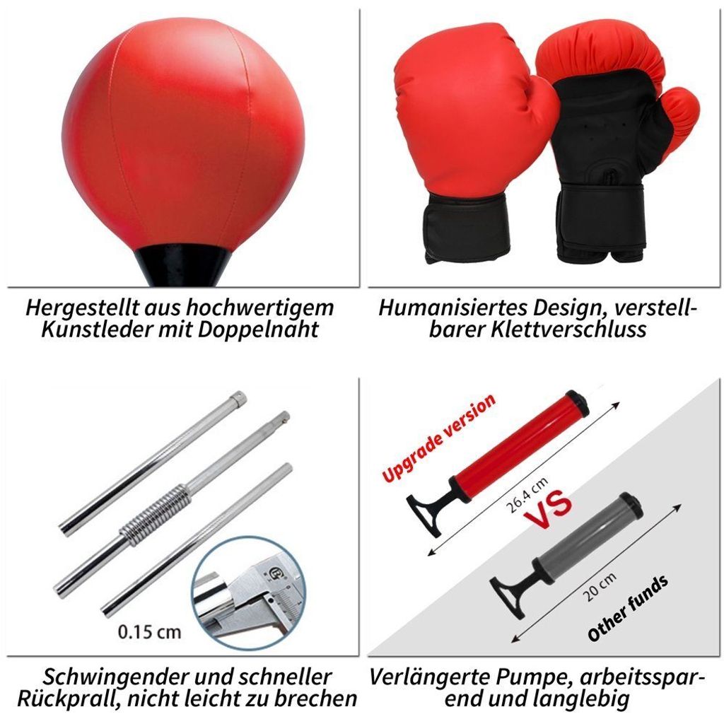 Das stabile Stahlrohr-Gestell und die solide Basis geben sicheren Halt, auch bei heftigen Schlägen. Im Lieferumfang ist alles dabei, was man braucht: Punchingball, Boxhandschuhe, Luftpumpe und das komplette Zubehör zum Aufbauen.