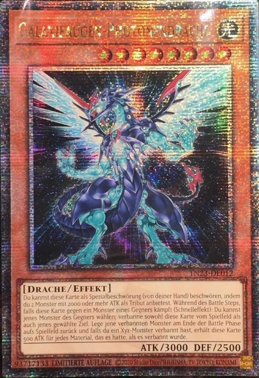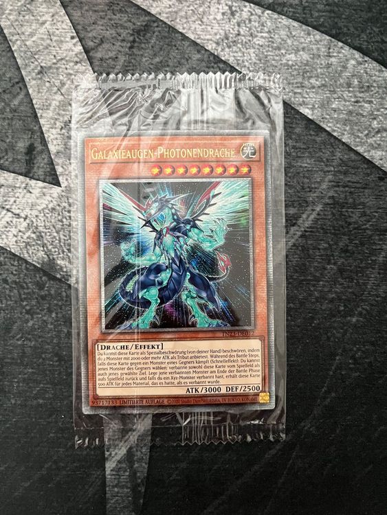 Alter, das ist ja der absolute Traum für jeden Yu-Gi-Oh Sammler! Der Galaxieaugen-Photonendrache in Quarter Century Secret Rare - und das auf Deutsch! Aus dem 25th Anniversary Tin: Dueling Heroes, also richtig limited. Der Kartenzustand ist Near Mint, also quasi wie frisch aus der Packung. Das Design glänzt einfach mega und die Verarbeitung ist erstklassig. Als Bonus ist sogar ein RC-Fieldcenter dabei - super praktisch für Turniere! Die Karte ist offiziell von Konami lizenziert, also keine Billigkopie. Perfekt fürs Deck oder einfach nur zum Sammeln. Wenn du wirklich was Besonderes willst, bist du hier genau richtig. Die Karte kommt sicher verpackt an, damit auch ja nichts knickt. Egal ob du Spieler oder Sammler bist - mit dieser Karte machst du nichts falsch. Einfach ein Must-have für jeden echten Yu-Gi-Oh Fan!