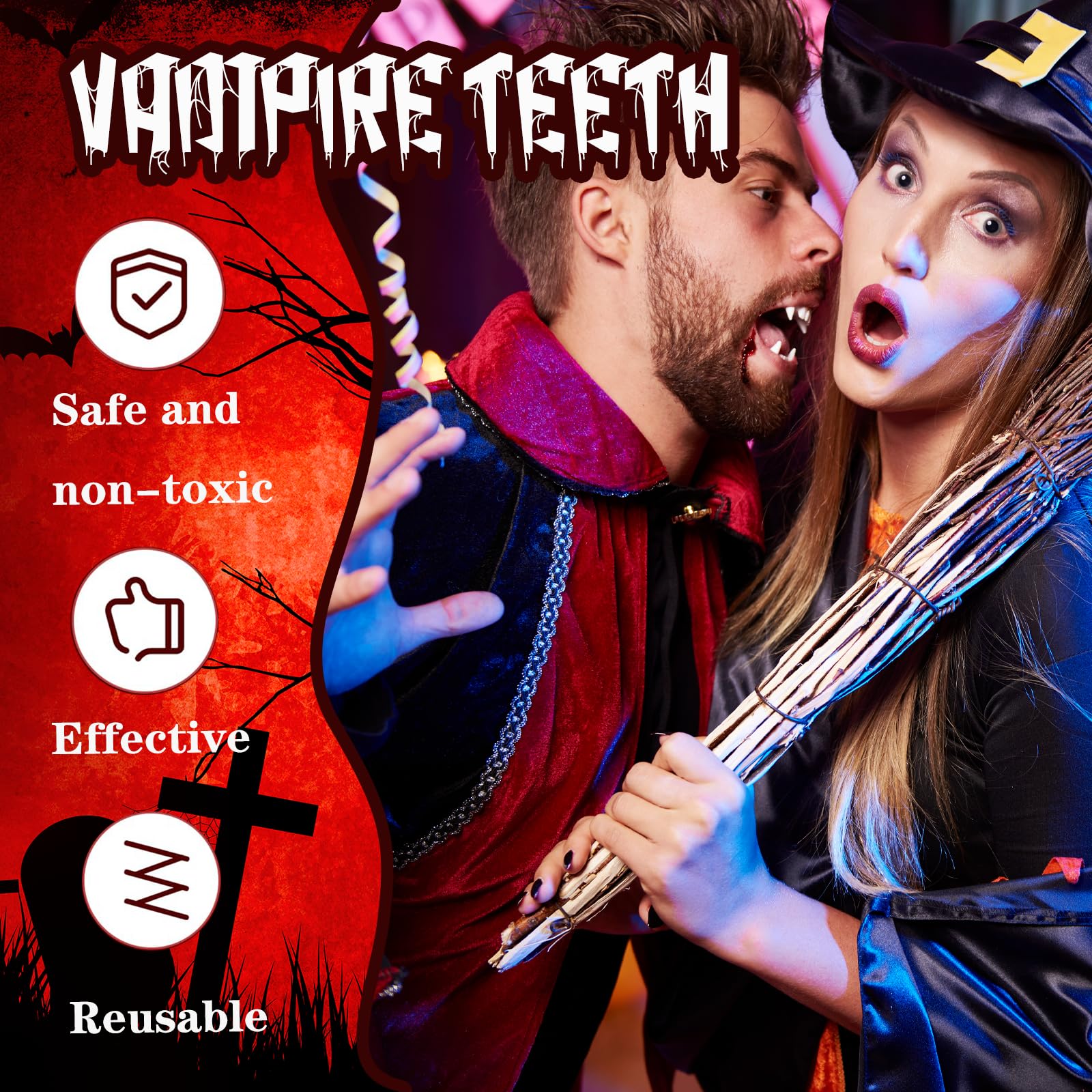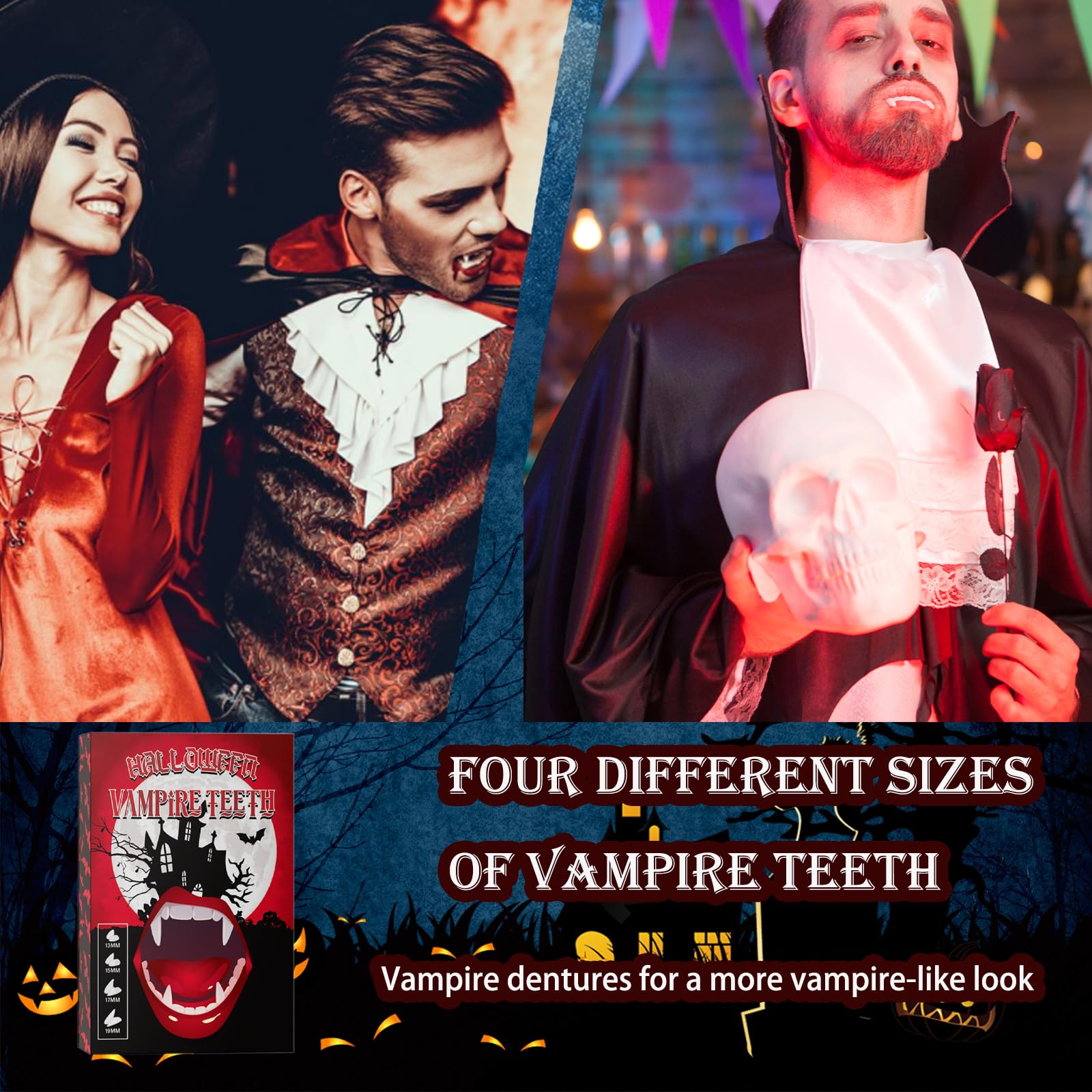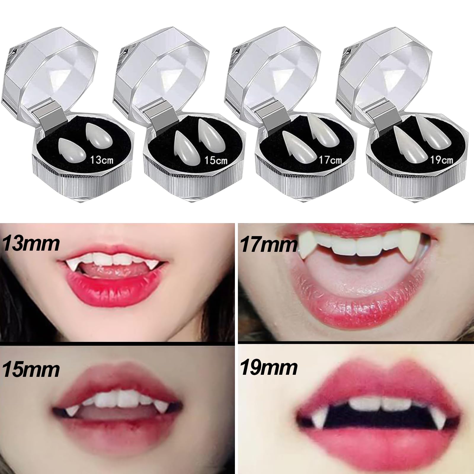 Mach dich gruselig mit diesem kompletten Vampir-Zähne Set! Enthalten sind 4 Paar Vampirfangs in verschiedenen Größen (12mm, 15mm, 17mm, 19mm) plus Kleber - da ist für jeden Biss die richtige Größe dabei. Einfach anzubringen: Klebeperlen in heißes Wasser legen, auf die künstlichen Zähne auftreiben und auf die eigenen Zähne drücken. Hält bombenfest! Aus ungiftigem Harz, absolut sicher in der Anwendung. Perfekt für Halloween, Karneval, Cosplay oder Theateraufführungen. Die lebensechte Optik sorgt für Gänsehaut - ob als klassischer Vampir, blutrünstiger Werwolf oder anderes Fabelwesen. Mit diesem Set wird dein Kostüm komplett und absolut authentisch. Einfach wieder entfernbar - der Spaß ist garantiert!