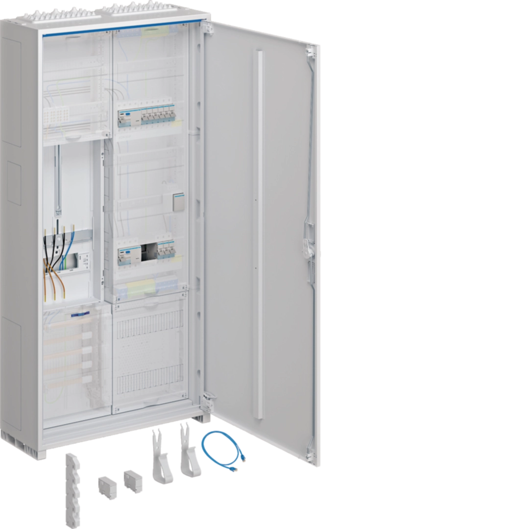 Dieser Hager Komplettschrank ist perfekt für den Hausanschluss! Maße 1100x550x205mm, Schutzart IP44 - also auch für feuchte Räume geeignet. Mit 1 Zählerplatz für Stromzähler und 5 Reihen für Sicherungen. Kann aufputz, unterputz oder teilversenkt montiert werden. In reinweiß RAL 9010 - passt in jedes Ambiente. Tür mit Klappgriff und Stangenverschluss - alles sicher verschlossen. Sammelschienen und Anschlussklemmen sind schon dabei. Einfach den Zähler und die Sicherungen einbauen und fertig ist die professionelle Elektroinstallation. Hager-Qualität made in Germany!