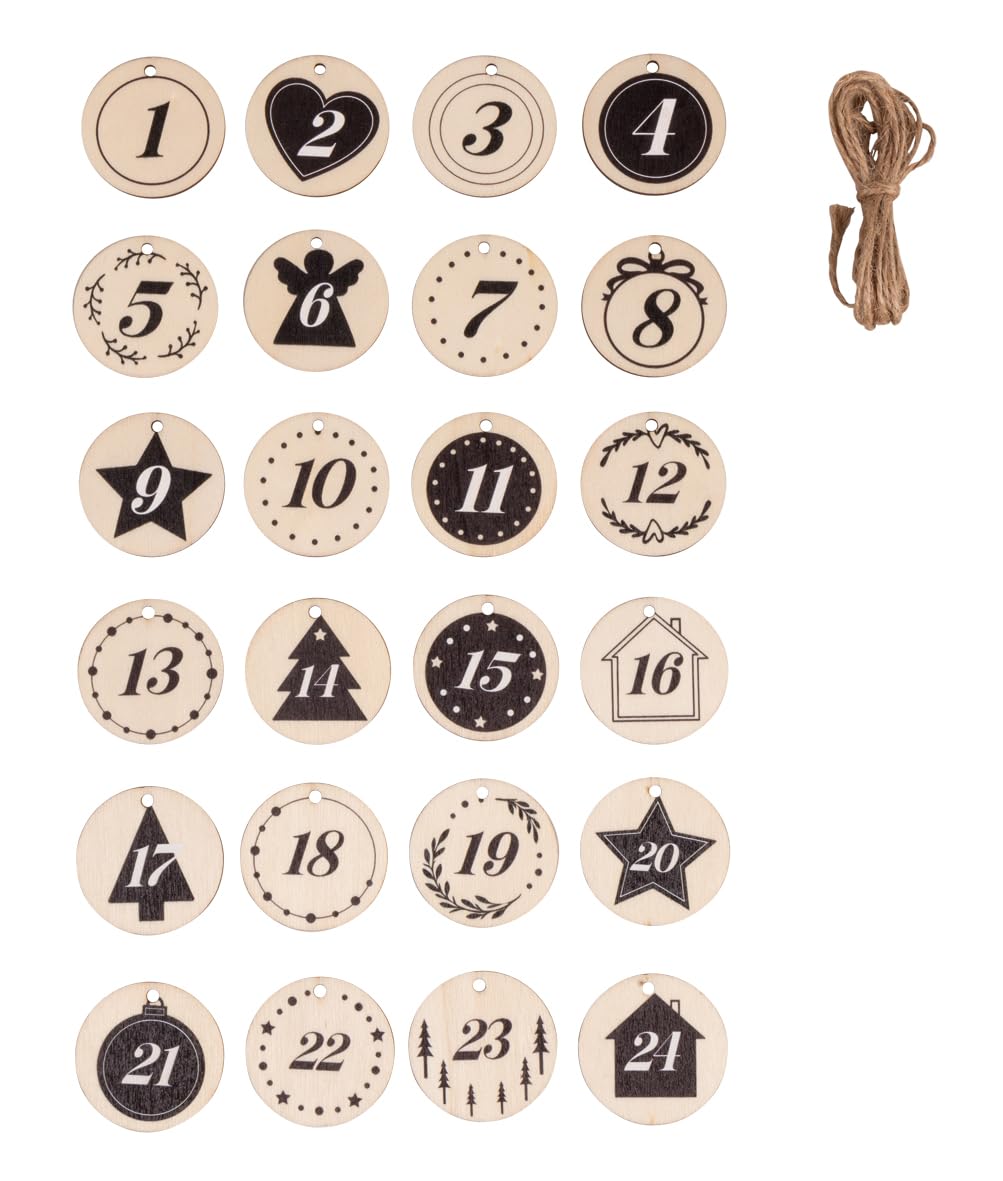 Wow, was für ein süßes Set für deinen selbstgemachten Adventskalender! Die 24 Holzfiguren mit Santa- und Wichtel-Motiven bringen sofort Weihnachtsstimmung in dein Zuhause. Einfach an die 2 Meter Juteschnur klammern und schon hast du eine wunderschöne Aufhängung für deine Päckchen.
