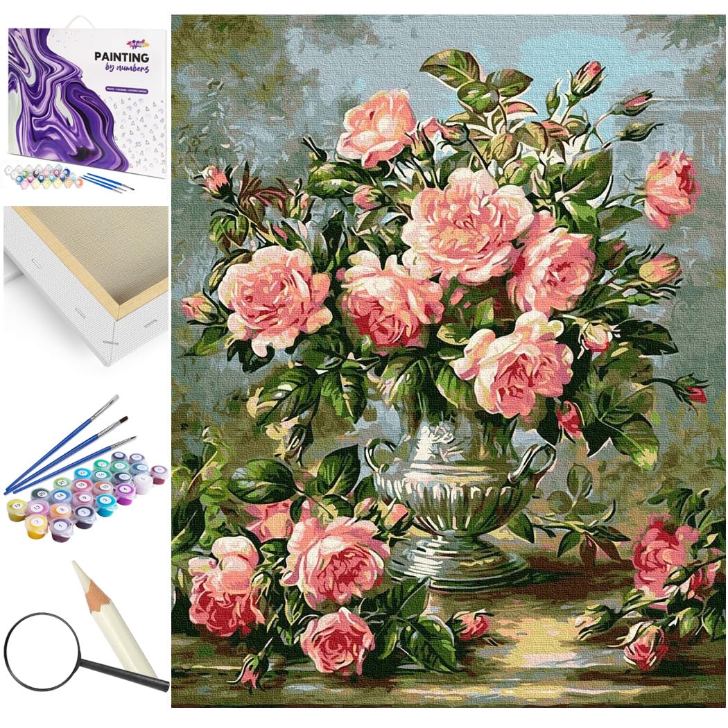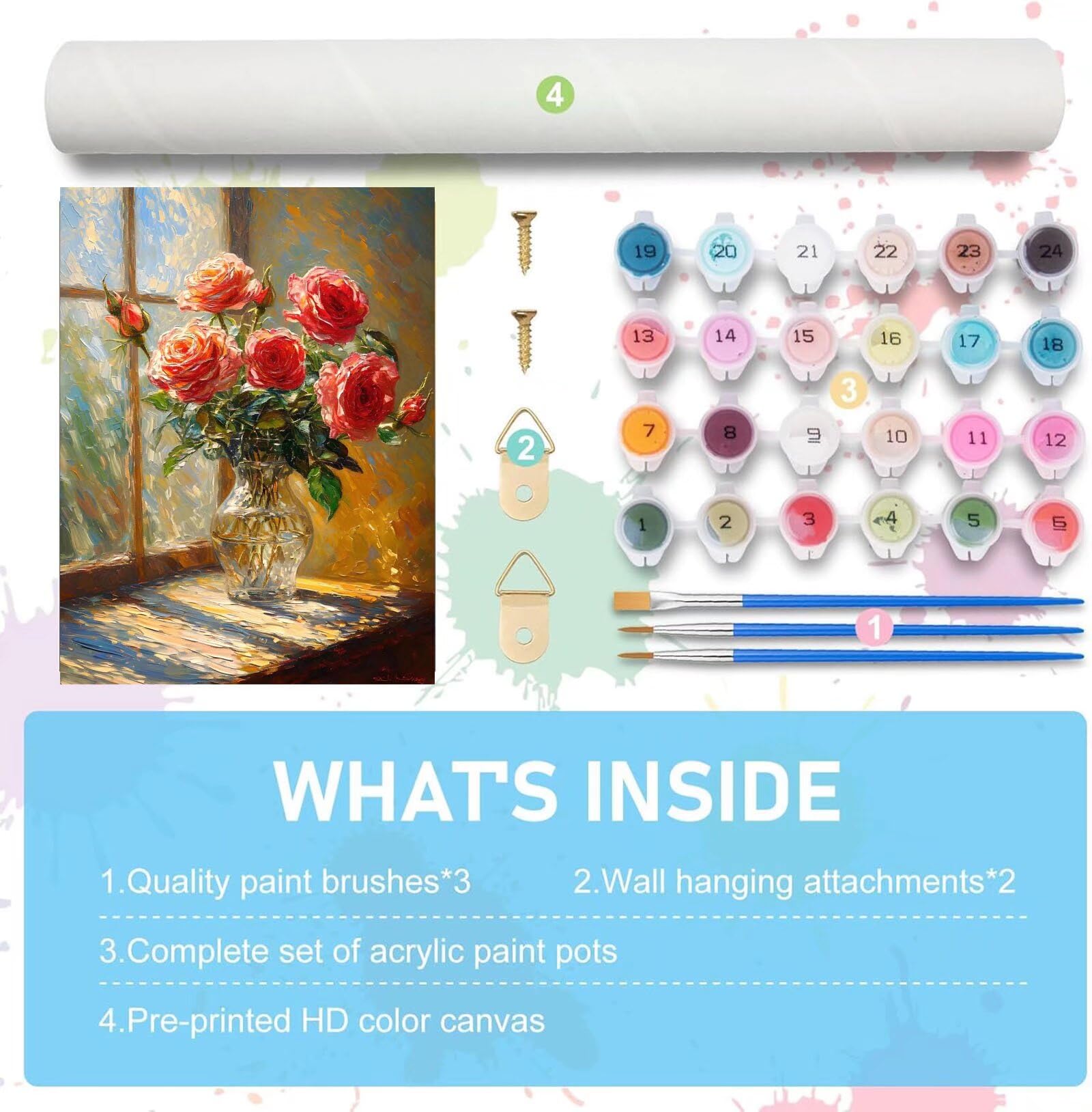 Entspannung pur mit diesem Malen nach Zahlen Set! Ein wunderschöner Rosenstrauß auf 30x40cm Leinwand - inklusive Holzrahmen. Alles dabei: HD-Leinwand mit klaren Zahlen, kompletter Acrylfarben-Satz, 3 Pinsel, Haken, Nägel und Klettverschluss. Keine Vorkenntnisse nötig - einfach nach Zahlen malen und dein eigenes Kunstwerk erschaffen. Perfekt zum Abschalten und die Konzentration verbessern. Wenn's fertig ist, einfach an die Wand hängen - sieht super aus im Wohnzimmer, Schlafzimmer oder Büro. Auch ne tolle Geschenkidee für kreative Menschen!