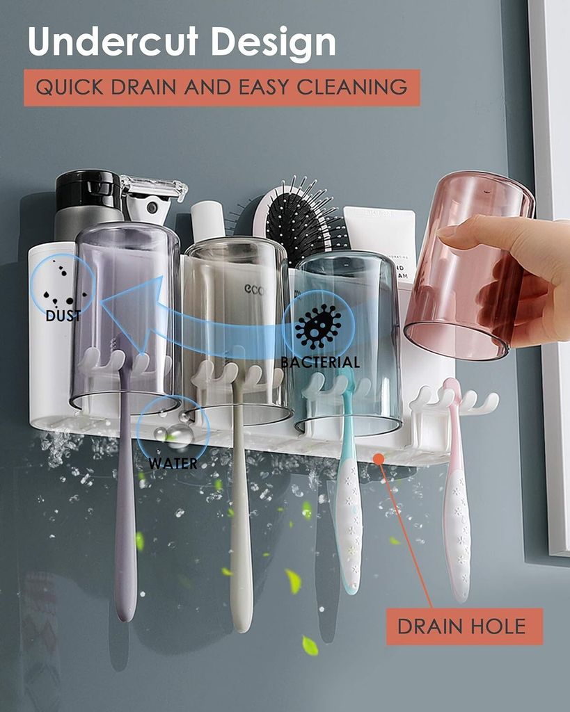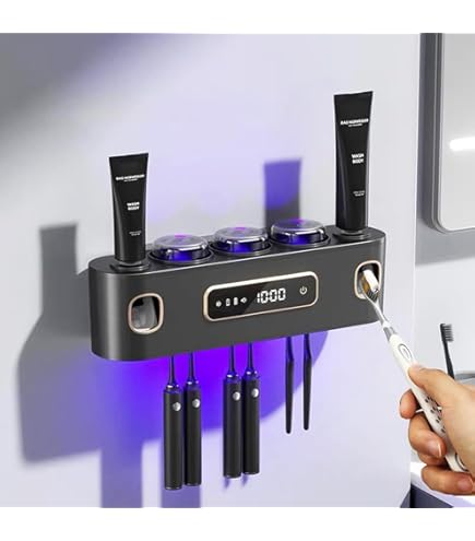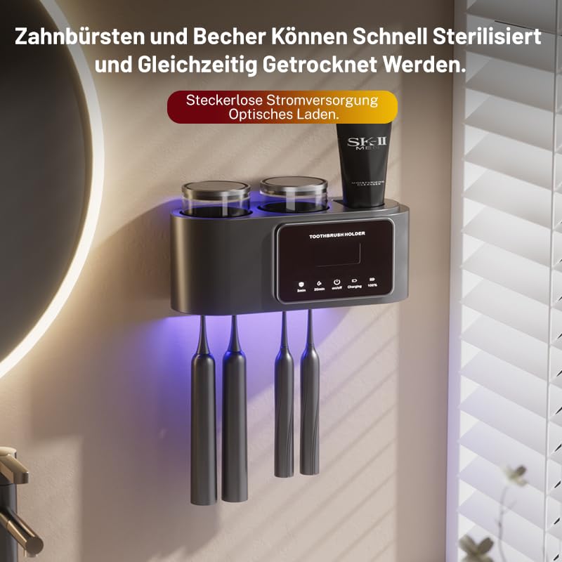 Schluss mit Chaos im Badezimmer! Dieses praktische Zahnbürstenhalter-Set bringt Ordnung in dein Bad. Mit 4 Schlitzen für Zahnbürsten und 2 Bechern mit cleverem Deckel-Design - so bleiben deine Utensilien staubfrei und trocken. Die umgedrehten Becher dienen gleichzeitig als Abdeckung, super hygienisch! Montage ganz ohne Bohren - einfach mit dem starken Klebepad an die Wand drücken und 24 Stunden warten. Perfekt für glatte Fliesen, Glas oder Metalloberflächen. In edlem Schwarz passt es zu jedem Badezimmer-Stil. Das Set enthält sogar ein USB-Kabel für zusätzliche Funktionen. Endlich alles an einem Platz: Zahnbürsten, Becher und mehr. Spart Platz und sieht dabei noch stylisch aus. Einfach reinigen, aufkleben und freuen - so einfach kann Badezimmer-Organisation sein!