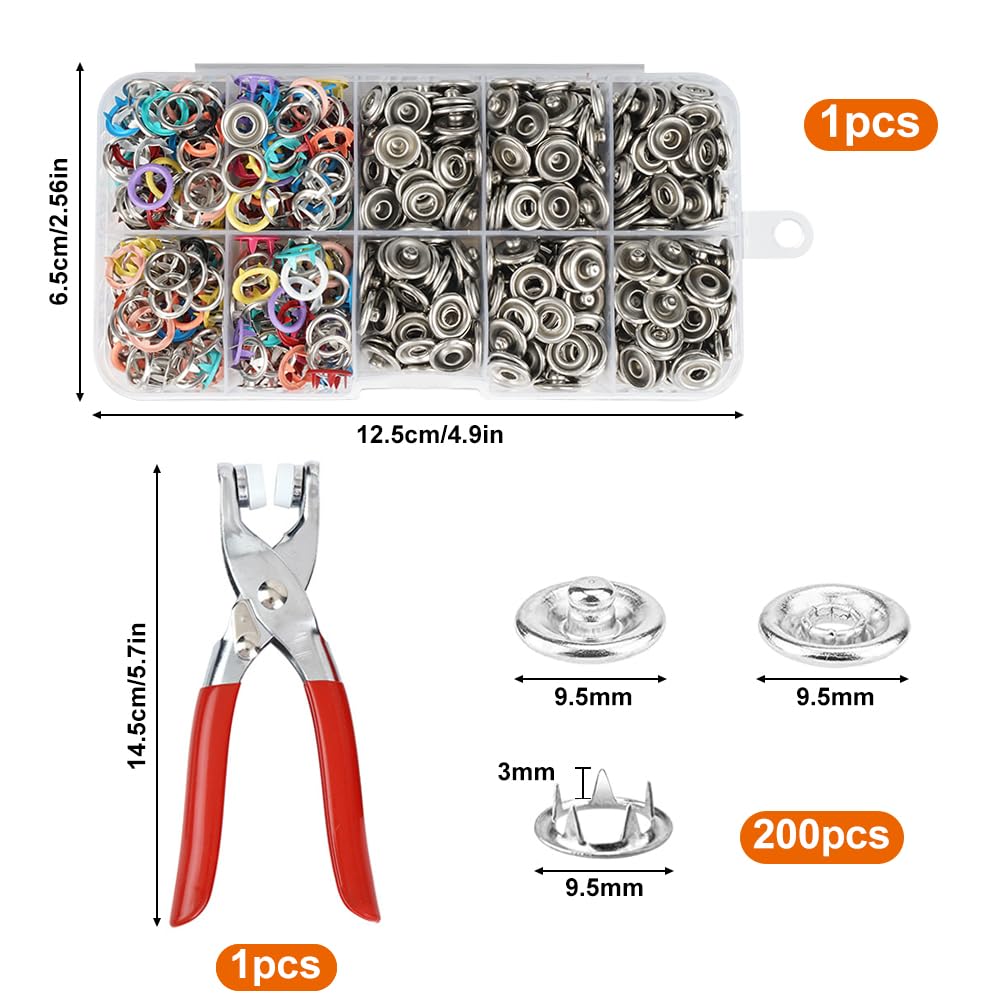 Nähen war gestern! Mit diesem kompletten Druckknopf-Set bringst du Knöpfe ganz ohne Nadel und Faden an. 200 silberne Druckknöpfe in 9,5mm, plus Zange und Aufbewahrungsbox - alles dabei, was du brauchst!