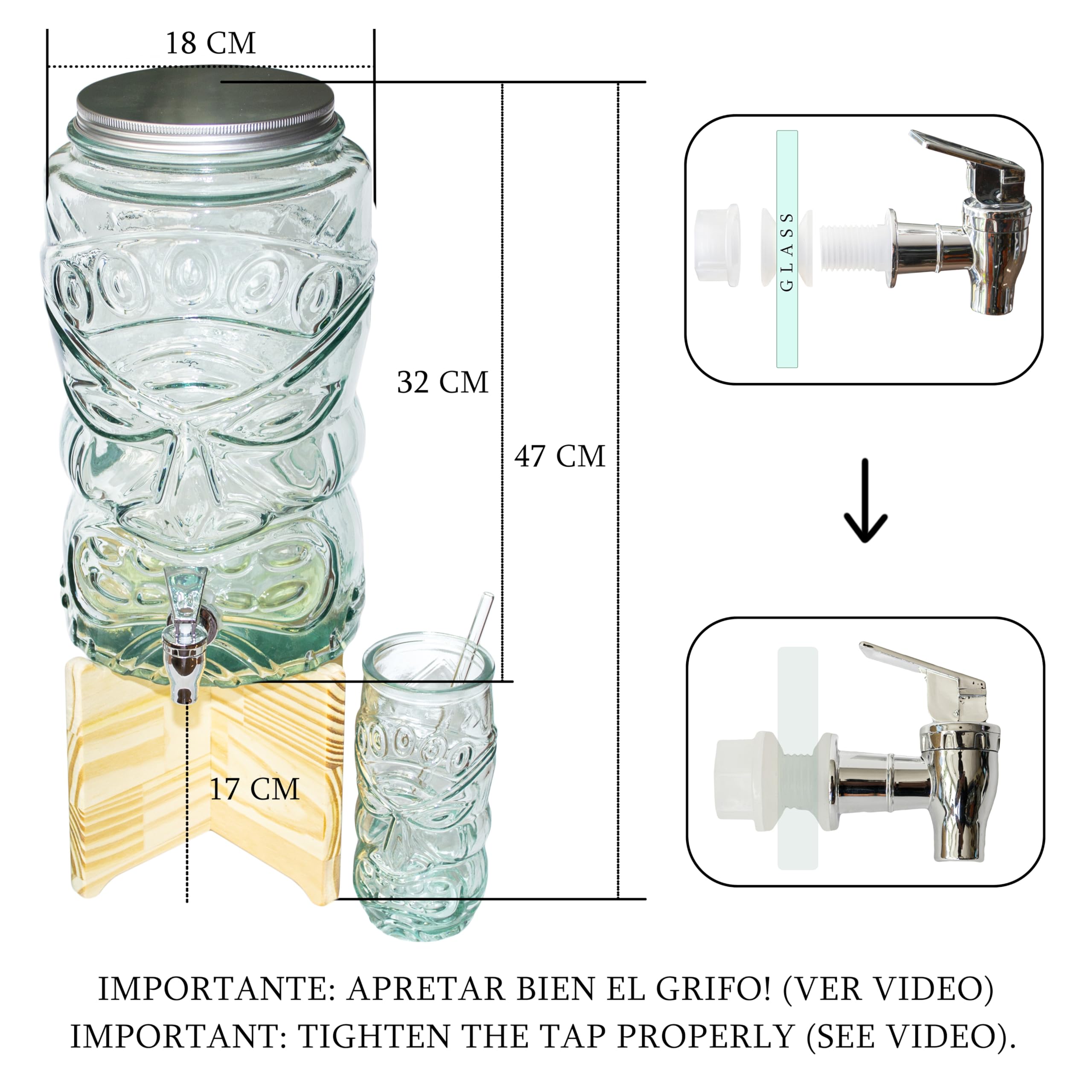 Perfekt für deine nächste Party! Dieser Getränkespender aus 100% recyceltem Glas fasst 4 Liter - genug für Sangria, Cocktails, Saft oder Bowle. Mit praktischem Zapfhahn für einfaches Einschenken. Im Set dabei: 2 passende Gläser (450ml), 2 Glas-Strohhalme und ein stylischer Holzständer. Hergestellt in Spanien - nachhaltig und umweltfreundlich. Einfach zu befüllen und zu reinigen. Der Tiki-Stil sieht total sommerlich aus und bringt Urlaubsfeeling nach Hause. Ob Geburtstag, Gartenparty oder gemütlicher Abend mit Freunden - mit diesem Spender wird jedes Getränk zum Highlight. Deine Gäste werden begeistert sein! Praktisch, nachhaltig und einfach klasse aussehend.