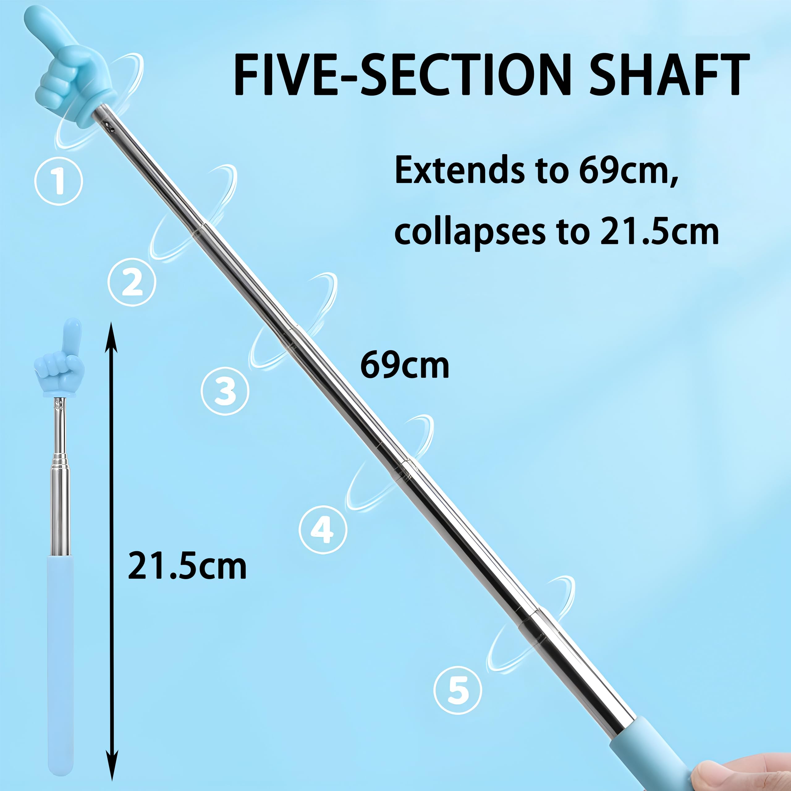 Perfekte Helfer für Unterricht und Präsentationen! Diese 4 ausziehbaren Zeigestäbe (20-68cm) in Schwarz, Rot, Gelb, Grün mit süßen Finger-Spitzen. Aus robustem Edelstahl mit Kunststoff-Finger - kratzt keine Tafeln oder Whiteboards. Einfach ausziehen und auf wichtige Punkte zeigen. Ideal für Lehrer, Dozenten oder Museumsführer. Ergonomischer Griff für bequeme Handhabung. Macht Präsentationen lebendiger und interaktiver. Einfach in der Tasche verstauen und überall mitnehmen. Praktisches Set für alle die viel erklären und präsentieren müssen!