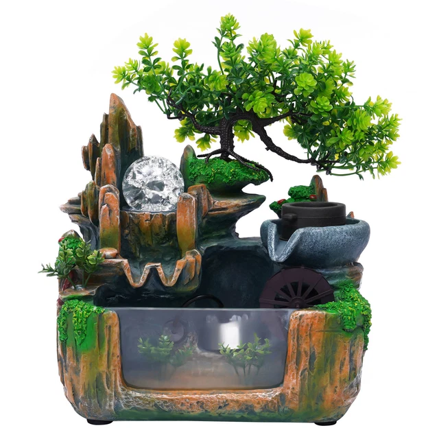 Entspannung pur mit diesem Zimmerbrunnen! Sieht aus wie eine Miniatur-Berglandschaft mit Bäumen, Blumen, Moos und fließendem Wasser. Das plätschernde Wasser und der geheimnisvolle Nebel helfen super beim Stressabbau. Mit mehrfarbiger LED-Beleuchtung, die die Kristallkugel in verschiedenen Farben erstrahlen lässt - kann auch als Nachtlicht verwendet werden. Das Wasserrad in Steinmühlen-Form sieht nicht nur cool aus, sondern symbolisiert auch Glück und Harmonie. Mit transparentem Becken - kannst du sogar Goldfische einsetzen! Maße: 25x15x27cm, Material: Harz. Inklusive Kristallkugel, Steinmühle, Zerstäuber, Wasserpumpe und Anleitung. Perfekt für Wohnzimmer, Schlafzimmer, Büro, Meditationsraum... Einfach aufstellen, Wasser einfüllen, anschließen und die entspannende Atmosphäre genießen! Aber Achtung: Zerstäuber nicht länger als 10 Stunden am Stück betreiben und nur sauberes Wasser verwenden.