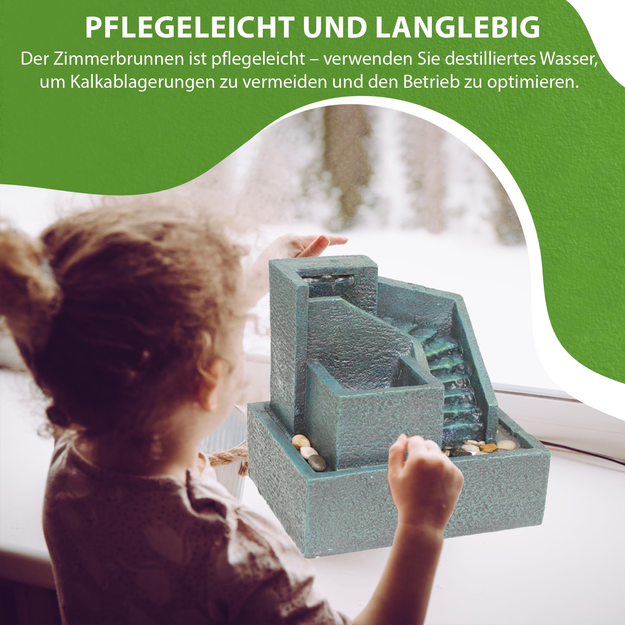 Entspannung pur mit diesem Zimmerbrunnen! Das sanfte Plätschern des Wassers combined mit beruhigender LED-Beleuchtung - einfach mega gemütlich. Aus hochwertigem Polyresin in Steinoptik - sieht täuschend echt aus! Maße: 13,5 x 18 x 13,5 cm - also perfekt für Sideboard, Regal oder Bürotisch. Die Pumpe arbeitet super leise, stört nicht beim Entspannen oder Arbeiten. Einfach mit destilliertem Wasser befüllen (gegen Kalk) und Stecker in die Dose - fertig! Schafft sofort eine wohlige Atmosphäre in jedem Raum. Ob Wohnzimmer, Schlafzimmer oder Büro - überall ein Hingucker. Auch super als Geschenk für Menschen, die etwas Ruhe und Entspannung brauchen. Das Design ist zeitlos und passt in fast jede Einrichtung. Und das Beste: Die Qualität ist top, der Brunnen hält ewig. Einfach mal ausprobieren und sehen, wie beruhigend das Plätschern wirkt. Perfekt nach einem stressigen Tag oder einfach so zum Runterkommen. Also, gönn dir diese kleine Auszeit - du hast sie dir verdient!