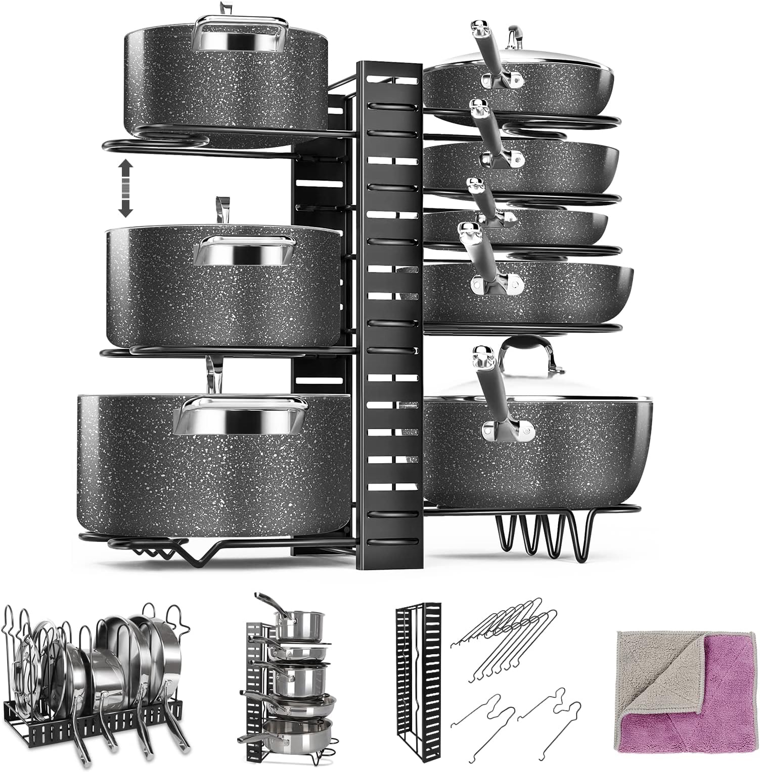 Endlich Ordnung im Küchenchaos! Dieser Topf-Organizer von ZoeQide bringt System in deine Töpfe und Pfannen - und sieht dabei noch richtig gut aus.\n\nMit den 3 Ebenen hast du alles perfekt im Blick: Unten die großen Töpfe, oben die Pfannen und in der Mitte die Deckel. Die 3 herausnehmbaren Trennwände kannst du ganz nach Bedarf anpassen - mal brauchst du mehr Platz für hohe Töpfe, mal für flache Backbleche.\n\nDas Metall ist pulverbeschichtet und rostfrei - hält ewig und ist super einfach zu reinigen. Einfach mit feuchtem Tuch abwischen und schon sieht's wieder aus wie neu.\n\nAufbau? Total easy - ganz ohne Werkzeug! Einfach die Teile zusammenstecken und schon kann's losgehen.\n\nPerfekt für:\n• Küchenschränke\n• Arbeitsplatte\n• Vorratsschrank\n• Sogar fürs Badezimmer\nMaße: 26x22,5x40cm - kompakt aber geräumig. Sag Tschüss zum lästigen Suchen und Hallo zur perfekten Küchenordnung!