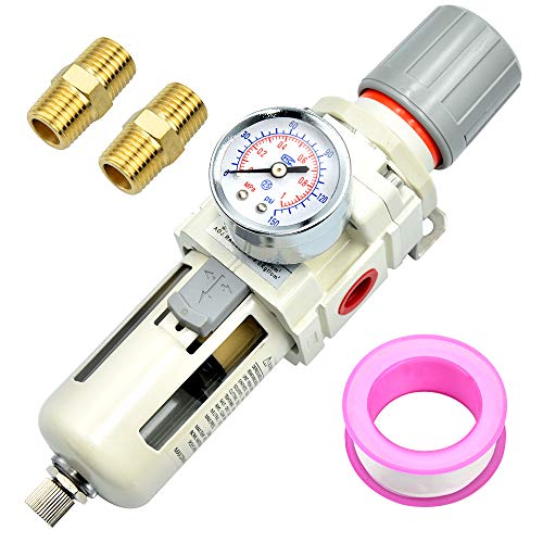 Für perfekte Druckluftqualität! Dieser 1/4 Zoll Luftfilter mit integriertem Druckregler und Manometer ist ein Muss für jede Werkstatt. Der Filter aus Messing filtert zuverlässig Verunreinigungen und Feuchtigkeit aus der Luft und schützt so deine wertvollen Druckluftwerkzeuge vor Schäden. Der transparente Behälter aus hitzebeständigem Polymermaterial ermöglicht eine einfache Kontrolle des Wasserspiegels. Mit einem Nenndurchfluss von 550 l/min und einem Arbeitsdruck von 0-10 bar ist er für die meisten Anwendungen ideal geeignet. Das Ablassventil macht die Reinigung zum Kinderspiel. Einfach zwischen Kompressor und Werkzeug installieren und schon hast du immer trockene, saubere Luft! Verlängere die Lebensdauer deiner Airbrush-Geräte, Lackierpistolen und anderen Druckluftwerkzeuge. Robust, langlebig und einfach zu warten - dieses Teil sollte in keiner Werkstatt fehlen! Perfekt für Hobbyhandwerker und Profis gleichermaßen.