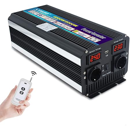 Brauchst du Strom unterwegs? Dieser LVYUAN Wechselrichter macht's möglich! Wandelt 24V Gleichstrom in 230V Wechselstrom um. Mit 4000W Dauerleistung und 8000W Spitzenleistung - genug für viele Geräte. Praktische kabellose Fernbedienung bis 10m Reichweite. LCD Display zeigt Eingangs- und Ausgangsspannung an. Mit 2 EU-Steckdosen und USB-Anschluss. Umfassender Schutz vor Überlast, Kurzschluss und Übertemperatur. Zwei Lüfter für optimale Kühlung. Perfekt für Wohnmobile, Boote, Baustellen oder Camping. Einfach an die Batterie anschließen und loslegen - unabhängige Stromversorgung wherever du bist! Mit 5,6kg kompakt und transportfreundlich.
