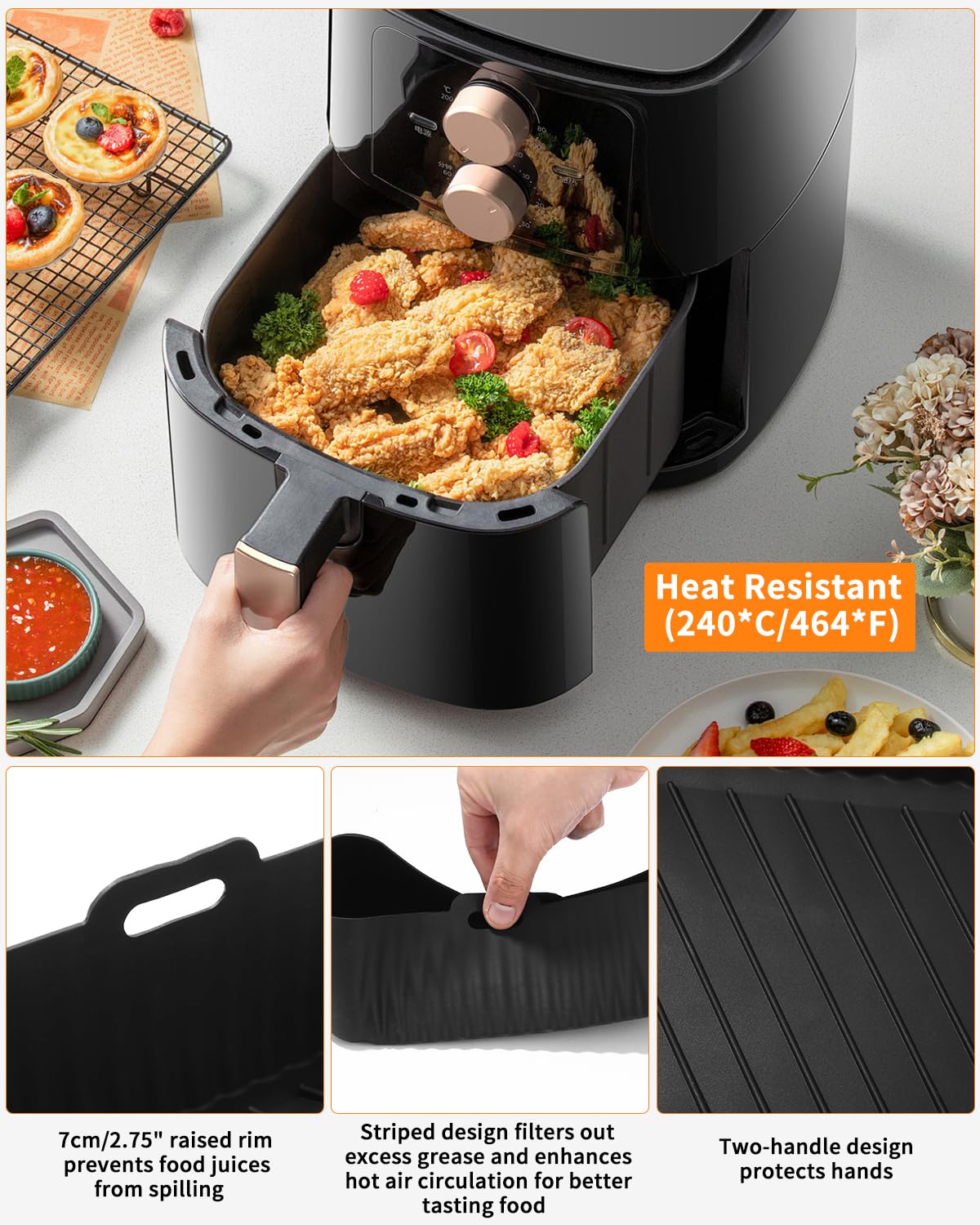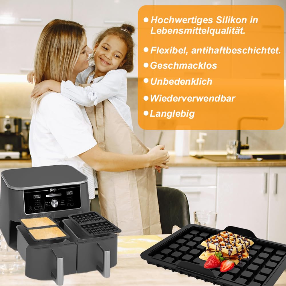 Hol das Maximum aus deiner Ninja Heißluftfritteuse heraus! Dieses 23-teilige Komplettset enthält alles, was du für abwechslungsreiches Kochen brauchst. Inklusive: 2 Silikonformen, Metallgestell, Spießhalter, Backgitter, Cupcake-Form, Muffinformen und praktische Utensilien wie Zange und Ölpinsel.\\n\\nKompatibel mit Ninja Foodi Max Dual Zone AF400EU, AF300EU und anderen Dual-Zone-Fritteusen mit 7,6-9,5 Liter Fassungsvermögen. Alle Silikonteile sind aus 100% lebensmittelechtem, BPA-freiem Silikon und hitzebeständig bis 230°C. Die Metallteile aus robustem Edelstahl 304.\\n\\nBesonderes Design sorgt für gleichmäßige Hitzeverteilung und verhindert Anbrennen. Spülmaschinenfest und leicht zu reinigen. Perfekt für Kuchen, Pizza, Kebabs und vieles mehr. Mit diesem Set wird deine Heißluftfritteuse zum vielseitigen Küchenhelfer - inklusive Garantie und exzellentem Kundenservice!