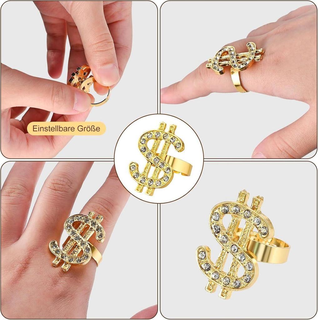 Back to the 80s! Dieses mega-coole Zuhälter Kostüm Set bringt den Retro-Chic zurück. Enthalten sind: 1 schwarze Sonnenbrille, 1 Dollar-Halskette, 1 Dollar-Ring, 1 goldenes Armband, 1 dicke Halskette und 3 Glücksringe. Aus hochwertiger Legierung mit funkelnden Strasssteinen, die nicht verblassen. Die Universalgrößen passen für die meisten Erwachsenen. Perfekt für Mottopartys, Karneval, 80er Jahre Events oder wenn du einfach mal wie ein Gangster aus den alten Zeiten aussehen willst. Einfach überziehen und der Star der Party sein! Die Brille aus robustem PE-Material sitzt bequem und behält ihre Form. Mach deinen Auftritt unvergesslich - mit diesem authentischen 80er Jahre Look!