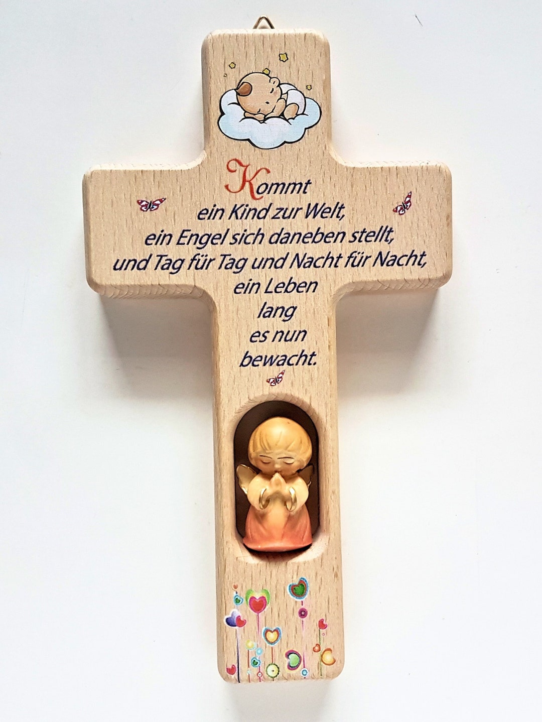 Ein wunderschönes Geschenk zur Taufe oder Geburt! Dieses liebevolle Holzkreuz mit Schutzengel-Motiv begleitet dein Kind von Anfang an. Mit dem tröstenden Spruch 'Wo ich gehe, wo ich stehe, bist Du, mein Engel, in der Nähe' schenkt es Geborgenheit und Schutz. Perfekt fürs Kinderzimmer über dem Bett oder Wickeltisch - mit 15x9 cm die ideale Größe für kleine Wände. Aus hochwertigem Holz und in zartem Weiß lackiert, ist es ein zeitloses Stück, das Jahre lang Freude bereitet. Inklusive kleinem Gebetsbüchlein für die ersten Gebete. Von Paten, Großeltern oder einfach von lieben Menschen - ein Geschenk, das von Herzen kommt und bleibende Erinnerungen schafft.