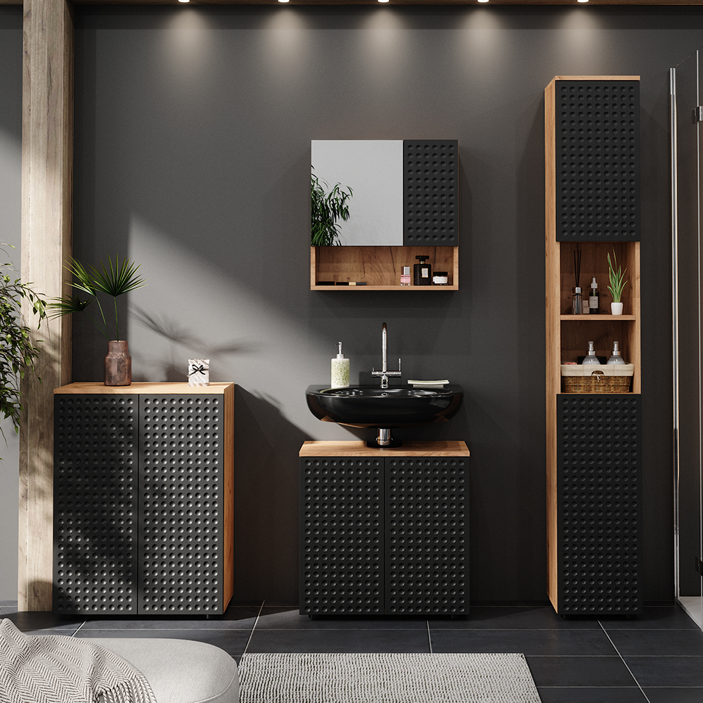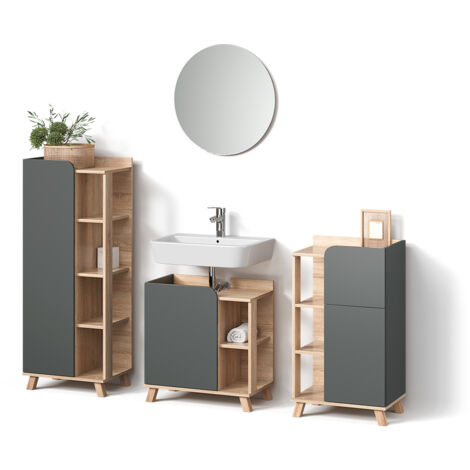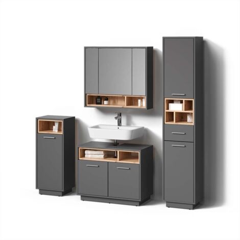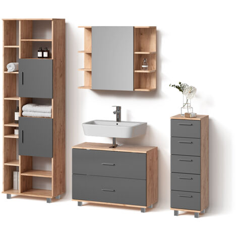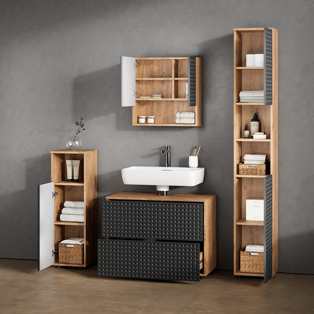 Wow, das Livinity Badmöbel-Set Ronco bringt richtig Stil in dein Badezimmer! Das 4-teilige Set in der trendigen Kombination Goldkraft Eiche und Anthrazit sieht nicht nur mega aus, sondern bietet auch super praktischen Stauraum. Mit offenen und geschlossenen Fächern hast du alles perfekt organisiert - Zahnbürste hier, Handtücher dort, und die ganzen Badezimmer-Kleinigkeiten verschwinden ordentlich in den Schubladen. Die Badmöbel sind aus hochwertiger 16-mm-Spanplatte mit Melaminharzbeschichtung gefertigt, einige Teile sogar aus MDF - also richtig stabil und pflegeleicht. Im Lieferumfang findest du: Waschbeckenunterschrank, Badspiegelschrank, Badschrank und Midischrank. Montagematerial und Anleitung sind natürlich dabei, die Deko auf den Fotos allerdings nicht. Die genauen Maße der einzelnen Teile siehst du auf den Produktbildern - so kannst du genau planen, wie alles in dein Badezimmer passt. Dieses Set ist perfekt für alle, die ihr Bad modernisieren wollen und dabei nicht auf praktischen Stauraum verzichten möchten. Einfach aufbauen und schon verwandelst du dein Bad in eine richtige Wohlfühloase!