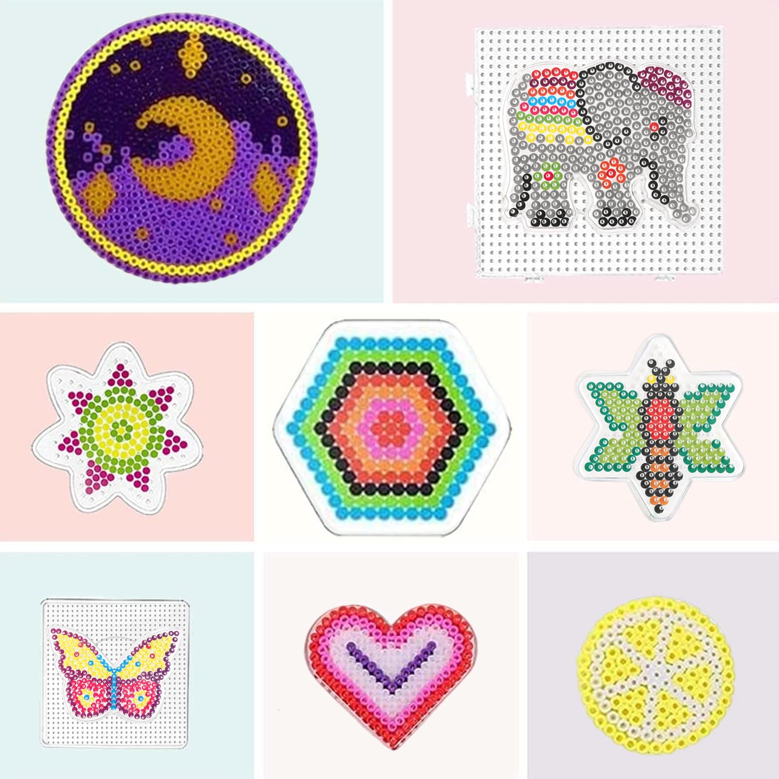 Kreativität kennt keine Grenzen mit diesem 8-teiligen Bügelperlen-Set! Die transparenten Stiftplatten in verschiedenen Formen wie Herz, Stern, Kreis und Quadrat lassen der Fantasie freien Lauf. Aus hochwertigem PVC gefertigt, sind sie ungiftig, geruchlos und super langlebig. Einfach die Perlen aufstecken, Bügelpapier drauf und mit dem Bügeleisen verschmelzen. Inklusive 2 weißen Pinzetten für einfaches Handling. Perfekt für Kinder ab 3 Jahren, um Motorik, Kreativität und räumliches Denken zu fördern. Ob Schlüsselanhänger, Armbänder oder bunte Bilder - mit diesem Set entstehen die coolsten Kunstwerke! Einfach ausprobieren und staunen, was alles möglich ist.