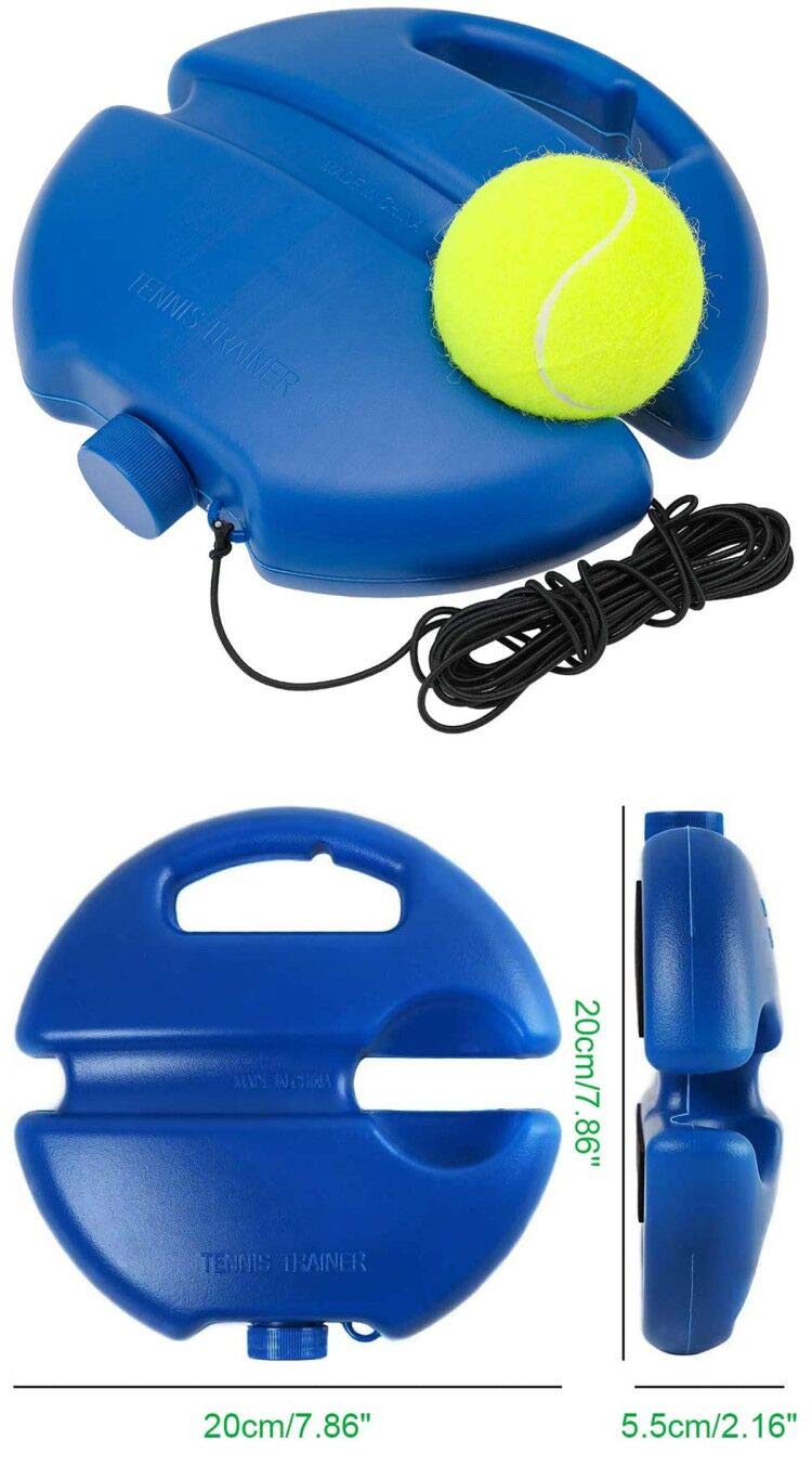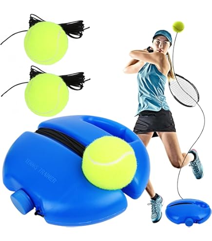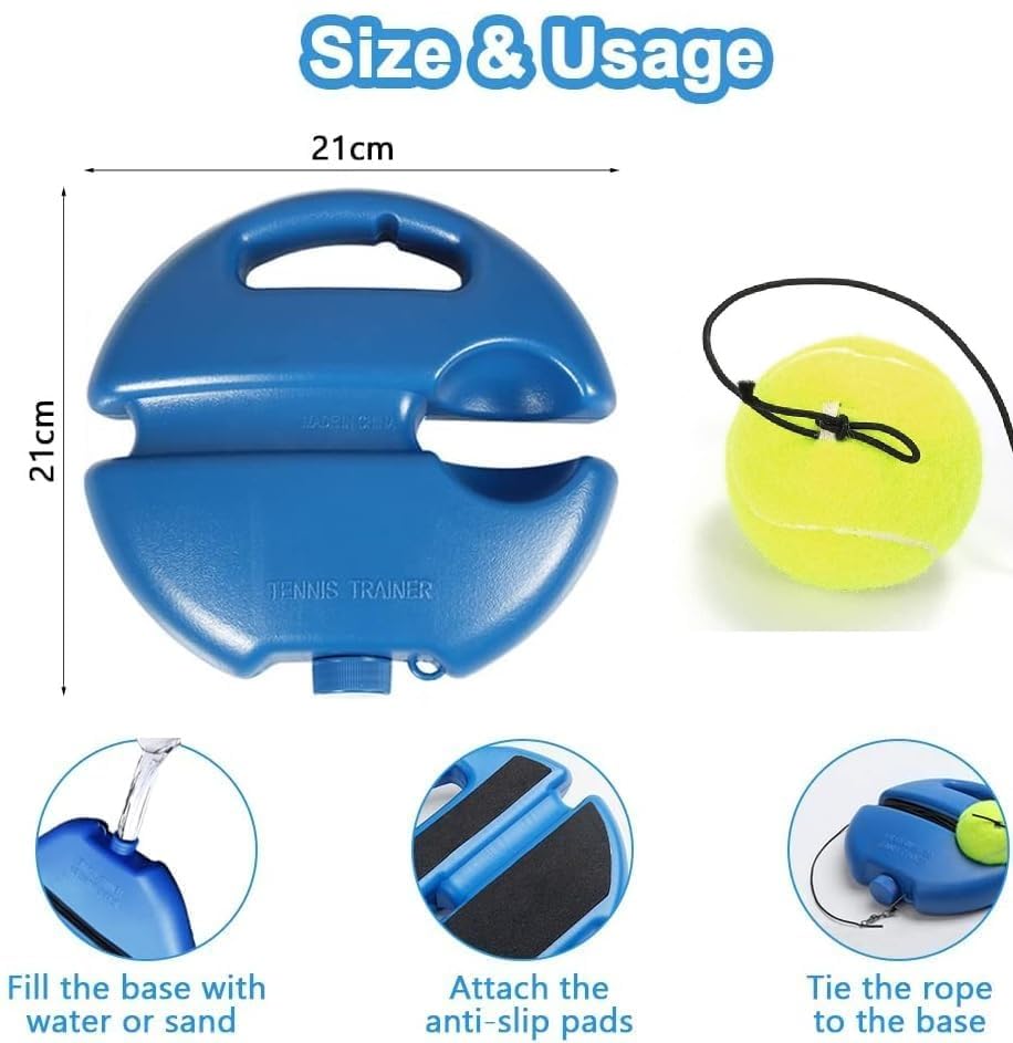 Dieser Tennistrainer mit Rebound-Ball ist der perfekte Trainingspartner für alle Tennis-Begeisterten! Du brauchst keinen Partner mehr - trainier einfach alleine, wann und wo du willst. Die Basis aus HDPE ist rutschfest und kann mit Wasser oder Sand gefüllt werden (Gewicht dann ca. 1,1 kg), sodass sie auch bei intensivem Training stabil steht. Die 3,6 Meter lange elastische Saite ist verstellbar, sodass du Rückpralldistanz und Geschwindigkeit an dein Level anpassen kannst. Perfekt für Hand-Auge-Koordination, Timing und Beinarbeit. Ob Vorhand, Rückhand, Volley oder Aufschlag - mit diesem Trainer kannst du alle Schläge üben. Super für Anfänger und Fortgeschrittene, ideal zum Aufwärmen oder für Fitness-Übungen. Leicht und kompakt - einfach mitnehmen zum Park, Tennisplatz oder im Garten verwenden. Im Lieferumfang: Basis, Haken und Ball mit Schnur. Mach dein Tennis-Training flexibler und effektiver!