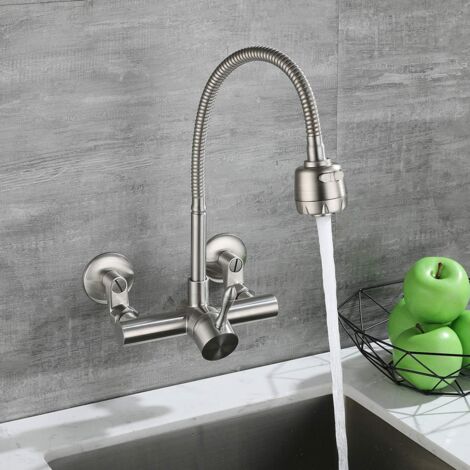 Dieser Wandwasserhahn bringt Style und Funktionalität in deine Küche! Aus hochwertigem Edelstahl 304 gefertigt, verchromt für einfache Reinigung und perfekten Korrosionsschutz. Der absolute Clou: Die Düse lässt sich um 360° drehen und das 15 cm lange Drehrohr gibt dir maximale Flexibilität - super praktisch für Doppelwaschbecken! Der eingebaute ABS-Perlator sorgt für einen weichen, sprühfreien Strahl und spart dabei Wasser. Der Keramik-Ventilkern garantiert eine präzise Temperatur- und Wassermengen-Regulierung, ist tropffrei und hält ewig. Montage ist kein Hexenwerk: Zwei-Loch-Befestigung mit exzentrischer S-Verbindung, die Löcher sind zwischen 13,5 und 16,5 cm einstellbar. Im Lieferumfang ist alles dabei, was du für die Installation brauchst. Ob in der Küche, im Bad oder sogar im Garten - dieser Wasserhahn macht überall eine gute Figur. Modern, funktional und langlebig - damit machst du nichts verkehrt!
