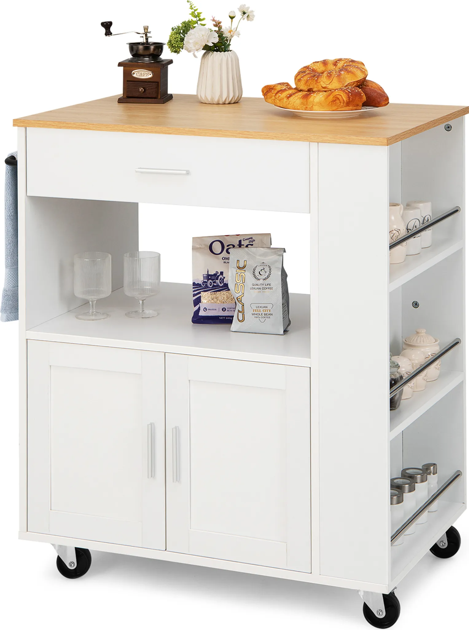 Wow, diese Kücheninsel ist ein echter Game-Changer für deine Küche! Mit ausziehbarer Arbeitsplatte von 45cm auf 73cm Breite - wenn mal mehr Platz zum Arbeiten oder für Gäste benötigt wird! Die Gesamtmaße von 140x94cm (LxB) bieten reichlich Stauraum und Arbeitsfläche. Drei Schubladen und zwei Schiebetüren geben Platz für alles, was in der Küche so anfällt - von Besteck über Kochutensilien bis zu Vorräten. Die fünf Rollen (davon zwei mit Feststeller) machen die Insel mobil - schieb sie einfach dorthin, wo du sie brauchst! Aus stabilem MDF und Metall gefertigt, trägt sie bis zu 75kg. Mit praktischen Extras wie Handtuchhalter und Becherhalter. Montage nötig, aber in ca. 30 Minuten erledigt! Perfekt für kleinere Küchen, als zusätzliche Arbeitsfläche oder als stylischer Servierwagen bei Partys. Sieht nicht nur gut aus in Weiß mit Holzoptik, sondern ist auch super praktisch! Einfach ein Muss für jede moderne Küche!