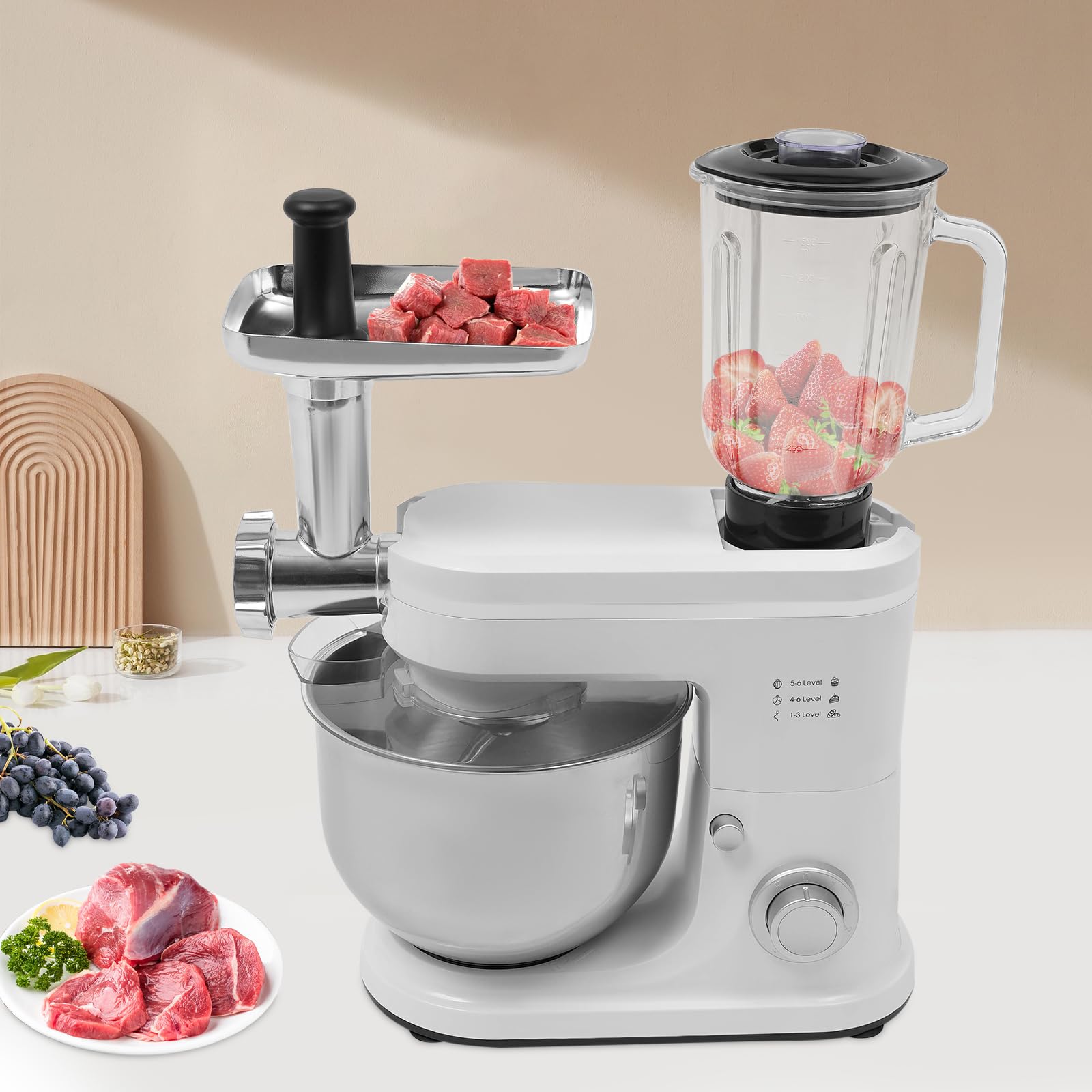 Wow, diese Küchenmaschine ist ein echter Alleskönner! Mit 1500 Watt Power meistert sie alles - vom Teig kneten über Fleisch wolfen bis zum Saft pressen. Die 6L Edelstahlschüssel ist riesig und perfekt für Familien. 6 Geschwindigkeitsstufen plus Pulsfunktion geben dir die volle Kontrolle. Der Fleischwolf macht frisches Hackfleisch zum Kinderspiel, und die 1,5L Saftpresse zaubert leckere Säfte. Alles aus hochwertigem Edelstahl und ABS - hält ewig! Komplettset mit allen Aufsätzen: Rührhaken, Schneebesen, Knethaken und mehr. Ein Traum für Hobbyköche und Backfans! Einfach aufstellen, einstecken und loslegen - deine Küche wird nie mehr dieselbe sein!