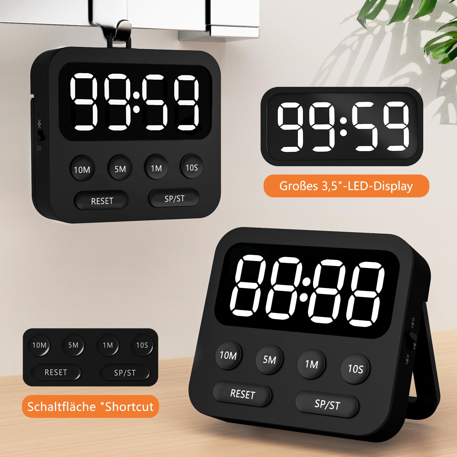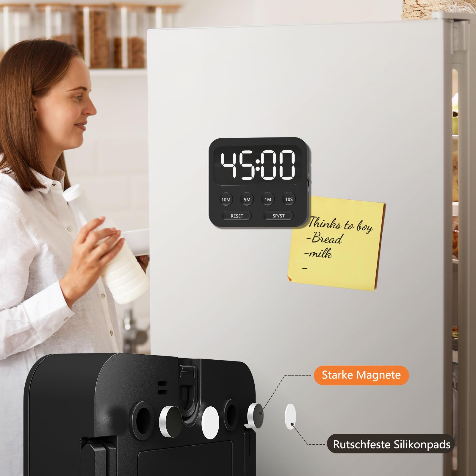 Nie wieder angebranntes Essen! Diese 5 magnetischen Timer sind deine besten Freunde in der Küche - und im ganzen Haus! Mit extra großem LCD-Display siehst du auf einen Blick, wie viel Zeit noch bleibt. Zwei Modi stehen zur Auswahl: Countdown (bis zu 99:59 Minuten) und normale Stoppuhr. Der Alarm ist mit 96 Dezibel so laut, dass du ihn sogar im Nachbarzimmer hörst - perfekt wenn's mal wieder schnell gehen muss! Oder stell ihn auf den leisen Modus um, wenn du ungestört lernen oder arbeiten willst. Dank der starken Magnete auf der Rückseite haftet der Timer sicher am Kühlschrank, Backofen oder jeder anderen metallischen Oberfläche. Oder stell ihn mit dem ausziehbaren Ständer auf den Tisch. Oder hänge ihn mit der praktischen Öse auf - drei Möglichkeiten, ihn genau dort zu platzieren, wo du ihn brauchst! Das 5er-Set in Weiß, Blau, Grün, Rosa und Schwarz ist perfekt, um verschiedenen Räumen oder Aufgaben Farben zuzuordnen. Aus robustem ABS-Kunststoff gebaut, übersteht er auch mal einen Sturz. Ob für's Kochen, Sporttraining, Büromeetings oder die Hausaufgaben der Kinder - mit diesen Timern behältst du immer die Kontrolle über die Zeit!