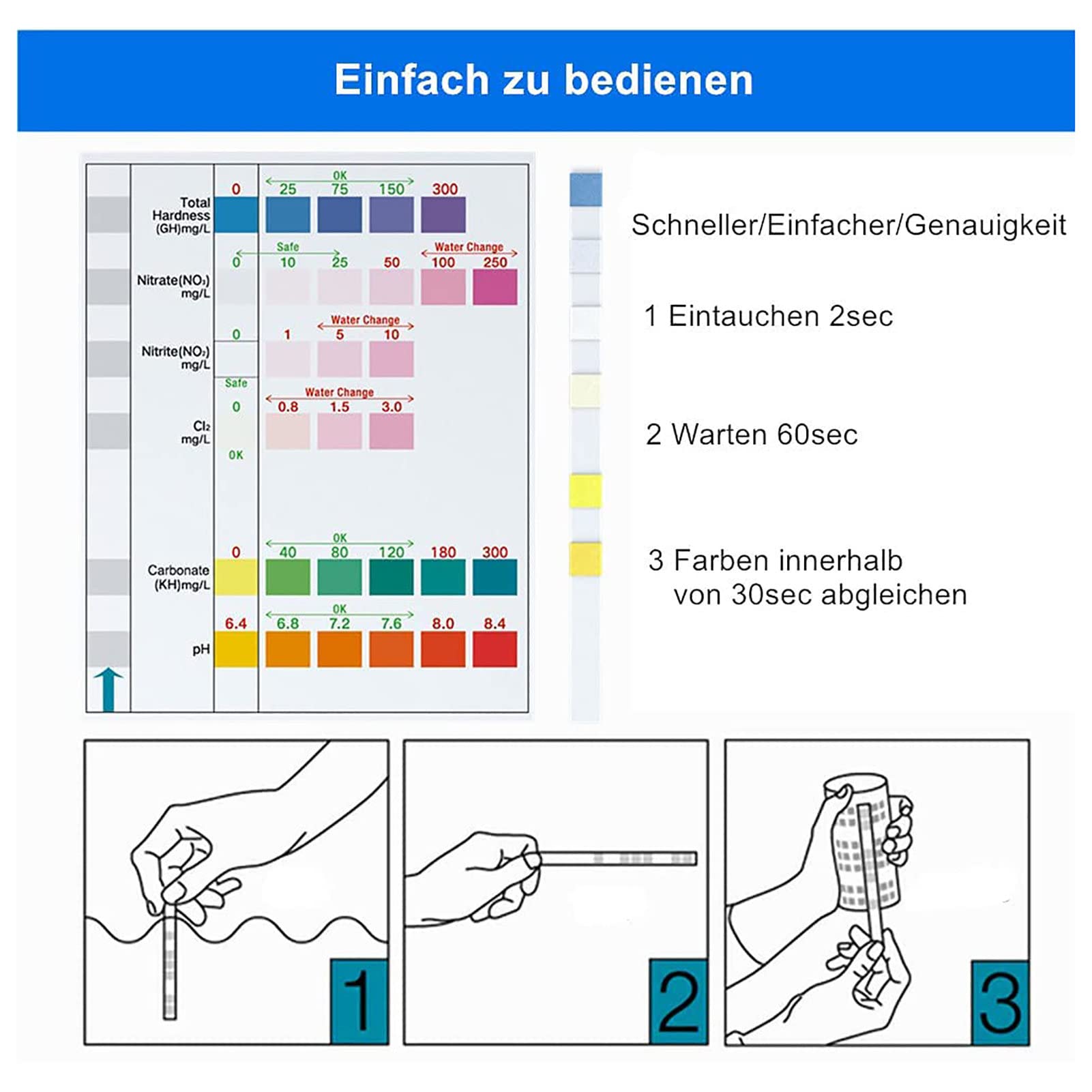 Einfache Wasser-Kontrolle für dein Aquarium! Mit diesen 6-in-1 Teststreifen checkst du schnell Nitrat (NO₃), Nitrit (NO₂), Chlor (Cl₂), Gesamthärte (GH), Karbonhärte (KH) und pH-Wert. 100 Streifen pro Packung - reicht für lange Zeit. Einfache Anwendung: Streifen eintauchen, kurz warten und mit der Farbskala vergleichen. Perfekt für Anfänger und Profis - für Süßwasser und Meerwasser. Hilft dir, deine Fische und Pflanzen gesund zu halten. An einem kühlen, trockenen Ort lagern - nicht in die Sonne legen. Ein echter Must-Have für jeden Aquarien-Besitzer!