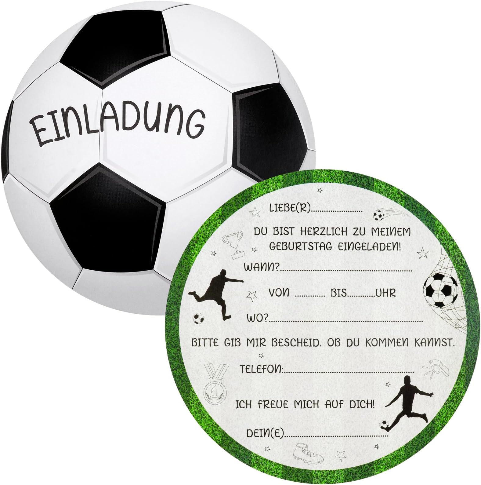 Planst du eine coole Fußball-Geburtstagsparty? Diese 12 Einladungskarten sind perfekt für deine Einladungen! Jede Karte ist mit fröhlichen Fußball-Motiven gestaltet - Tore, Bälle, Medaillen - alles was kleine Fußballfans lieben. Hergestellt aus hochwertigem 350g Papier das sich robust anfühlt und gut in der Hand liegt. Die vordefinierten Felder machen das Ausfüllen super einfach - einfach Name, Datum, Ort und Zeit eintragen und fertig. Perfekt für Kindergeburtstage, Gartenpartys, Sommerfeste oder Vereinsfeiern. Mit 12 Stück hast du genug für die ganze Mannschaft und deren Familien. Die grün-schwarz-weiße Farbgebung passt perfekt zum Fußball-Thema. Mach die Vorfreude auf die Party schon mit den Einladungen groß! Verteile sie in der Schule, im Kindergarten oder im Sportverein - alle werden begeistert sein. Schaff unvergessliche Erinnerungen für dein Kind und seine Freunde - mit diesen professionellen Einladungskarten startest du perfekt durch!