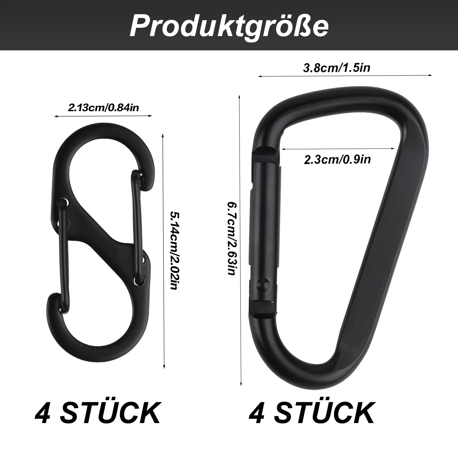 Karabiner - die praktischsten Helfer überhaupt! Dieses Set mit 8 Teilen (4x S- und 4x D-Karabiner) ist perfekt für unterwegs. Aus robustem Aluminium, leicht aber super stabil! Die S-Karabiner haben zwei separate Öffnungen - mega praktisch zum schnellen Befestigen. Und die D-Karabiner mit Federverschluss sind absolut sicher, nichts fällt runter! Perfekt für Rucksäcke, Schlüssel, Wasserflaschen oder Werkzeug. Ob beim Camping, Wandern oder Radfahren - diese Karabiner sind immer dabei. Leicht, kompakt und halten was aus! Aber Achtung: Fürs Klettern in großen Höhen sind sie nicht geeignet. Für den Alltag aber absolut perfekt - organisiere dein Equipment mit diesen coolen Clips!