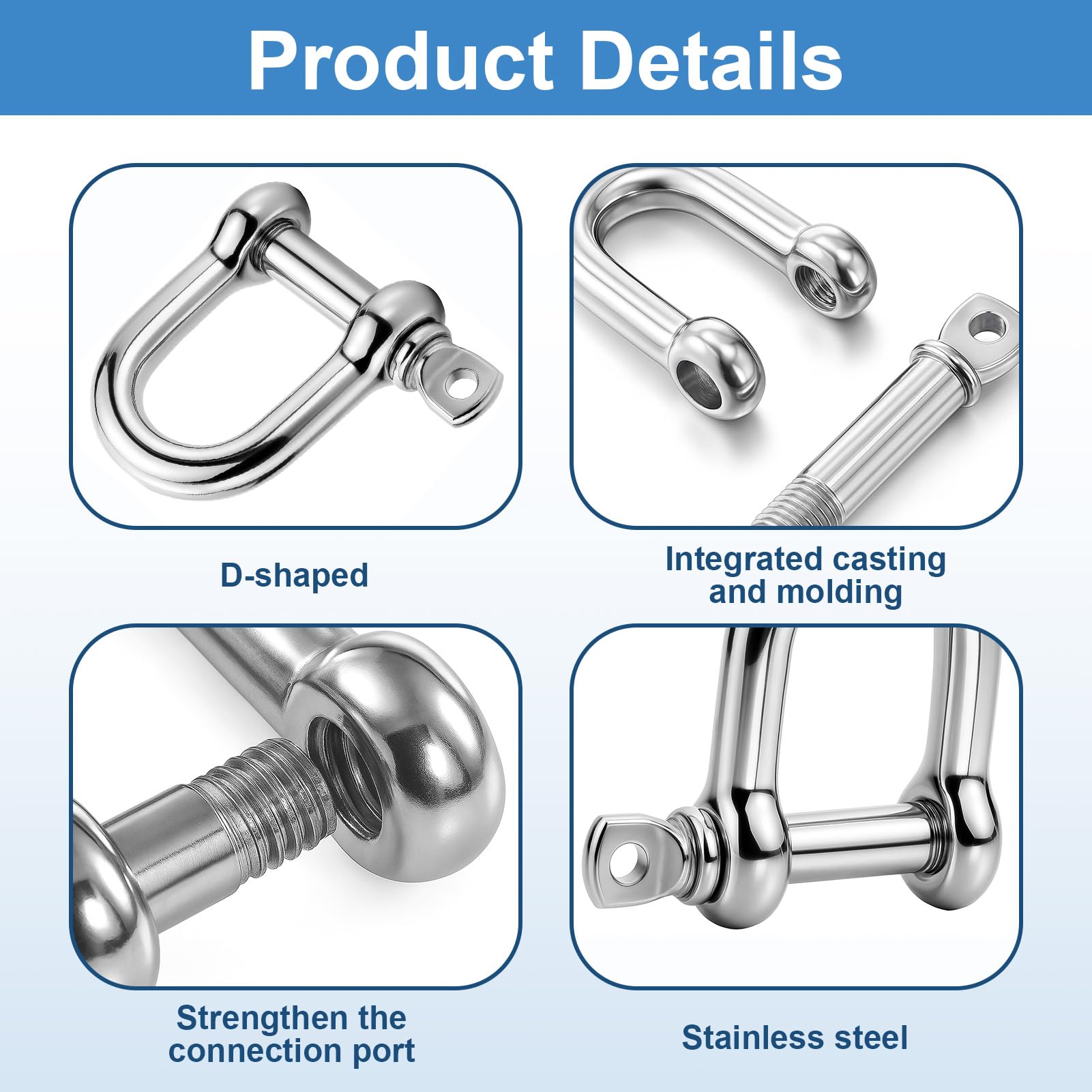 Hey, diese 12 Schäkel im Set sind echt praktisch für alle möglichen Projekte! Aus robustem 304 Edelstahl gefertigt, sind sie absolut korrosionsbeständig und halten auch bei Wind und Wetter durch. Die M4 Größe ist perfekt für Takelage, Stahlseile, Ketten und alle möglichen Befestigungen drinnen und draußen. Der Schraubbolzen macht die Montage super einfach - einfach reinschrauben und schon hast du eine sichere Verbindung. Die glatte Oberfläche ohne scharfe Kanten sorgt dafür, dass du dich nicht verletzt. Egal ob du am Boot arbeitest, etwas im Garten befestigen willst oder professionelle Projekte umsetzt - mit diesen 12 Teilen bist du bestens ausgestattet. Die einteilige Konstruktion garantiert maximale Stabilität und Langlebigkeit. Einfach ein Must-Have für jeden Heimwerker und Profi!