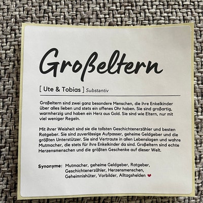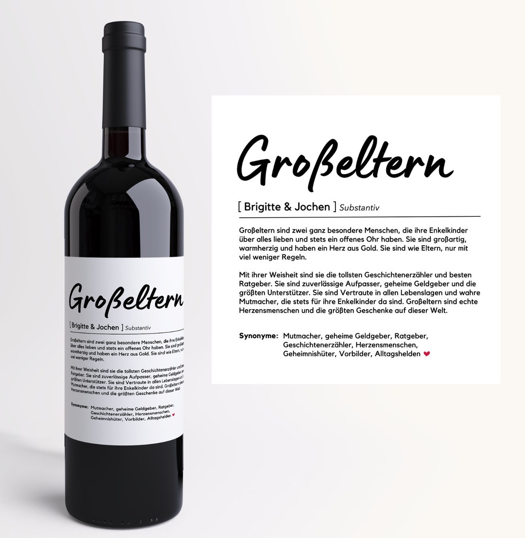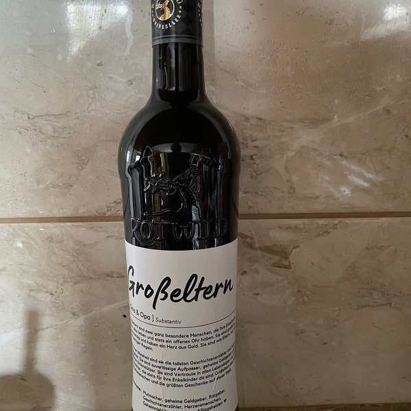 Die perfekte Überraschung für werdende Großeltern! Diese 4 Flaschenetiketten im Duden-Look machen jede Wein- oder Bierflasche zum persönlichen Geschenk. Mit liebevollen Beschreibungen wie 'Oma: Die Beste der Welt' - einfach das alte Etikett entfernen, neues aufkleben und verschenken! Super für Schwangerschaftsverkündungen, Geburtstage oder Weihnachten. Maße: 11x10cm, nassfest und klimaneutral in Deutschland gedruckt. Deine Eltern werden total gerührt sein, wenn sie diese persönliche Nachricht auf ihrer Flasche entdecken. Einfach, aber so effektvoll!