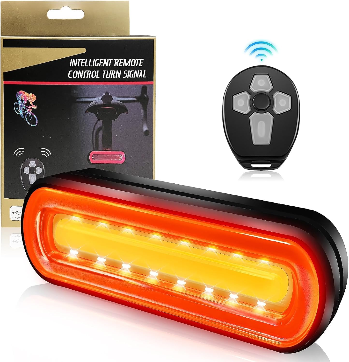 Sicherheit geht vor! Dieses coole Blinker-Set fürs Fahrrad macht dich im Straßenverkehr gut sichtbar. Mit praktischer Fernbedienung - so musst du nicht mehr vom Lenker greifen!\\n\\n• 5 Lichtmodi: Links/Rechts blinken, Dauerlicht, Blinkmodus\\n• USB-aufladbar (600 mAh Akku)\\n• Bis zu 5 Stunden Laufzeit\\n• 30 gelbe + 8 rote LEDs\\n• Robustes ABS-Gehäuse\\n\\nEinfach per Fernbedienung die gewünschte Funktion wählen. Ob beim Abbiegen oder als Warnlicht - du wirst besser gesehen. Auch perfekt für E-Scooter!\\n\\nDer Akku hält lange und lädt schnell wieder auf. Mach deine Fahrten sicherer - egal bei Tag oder Nacht!