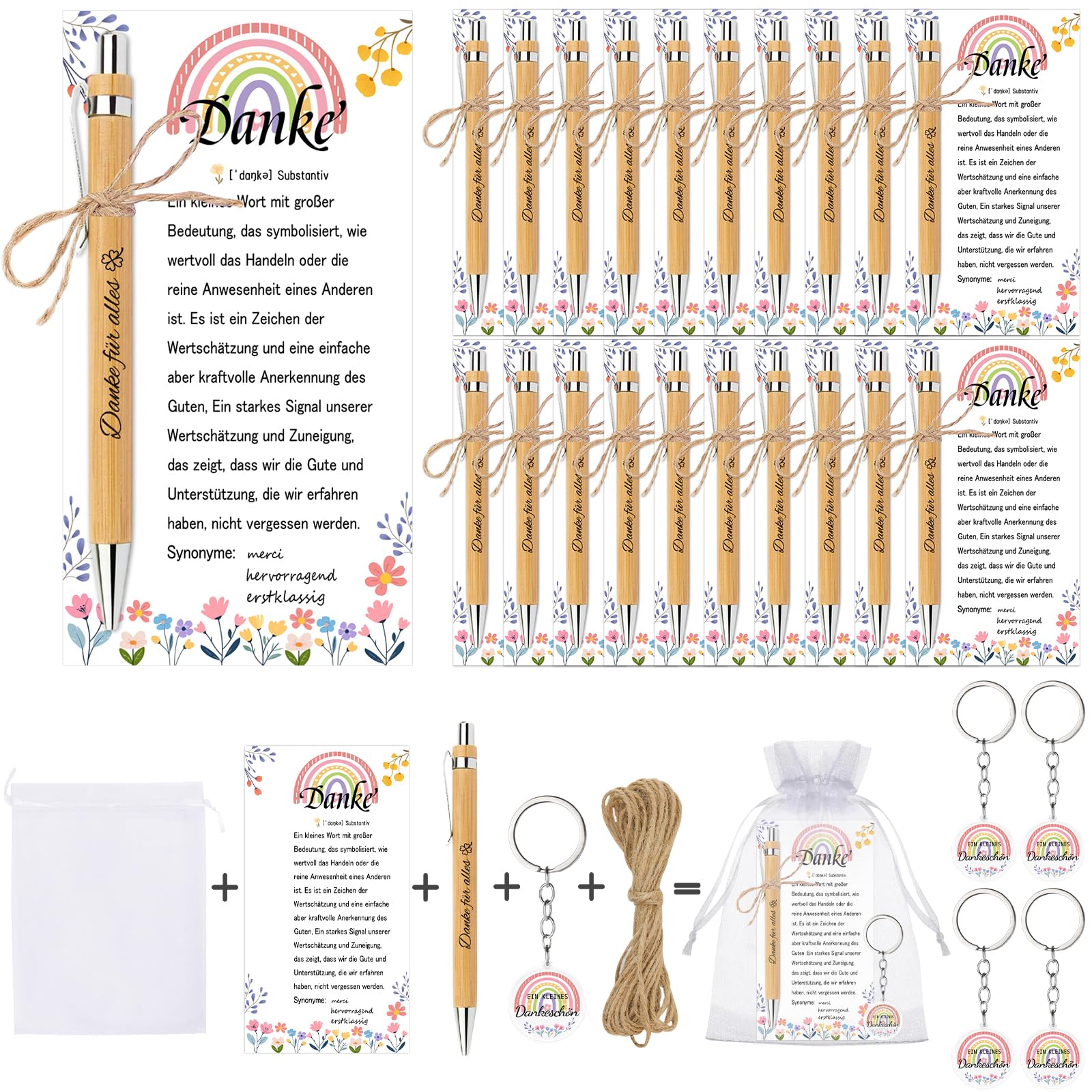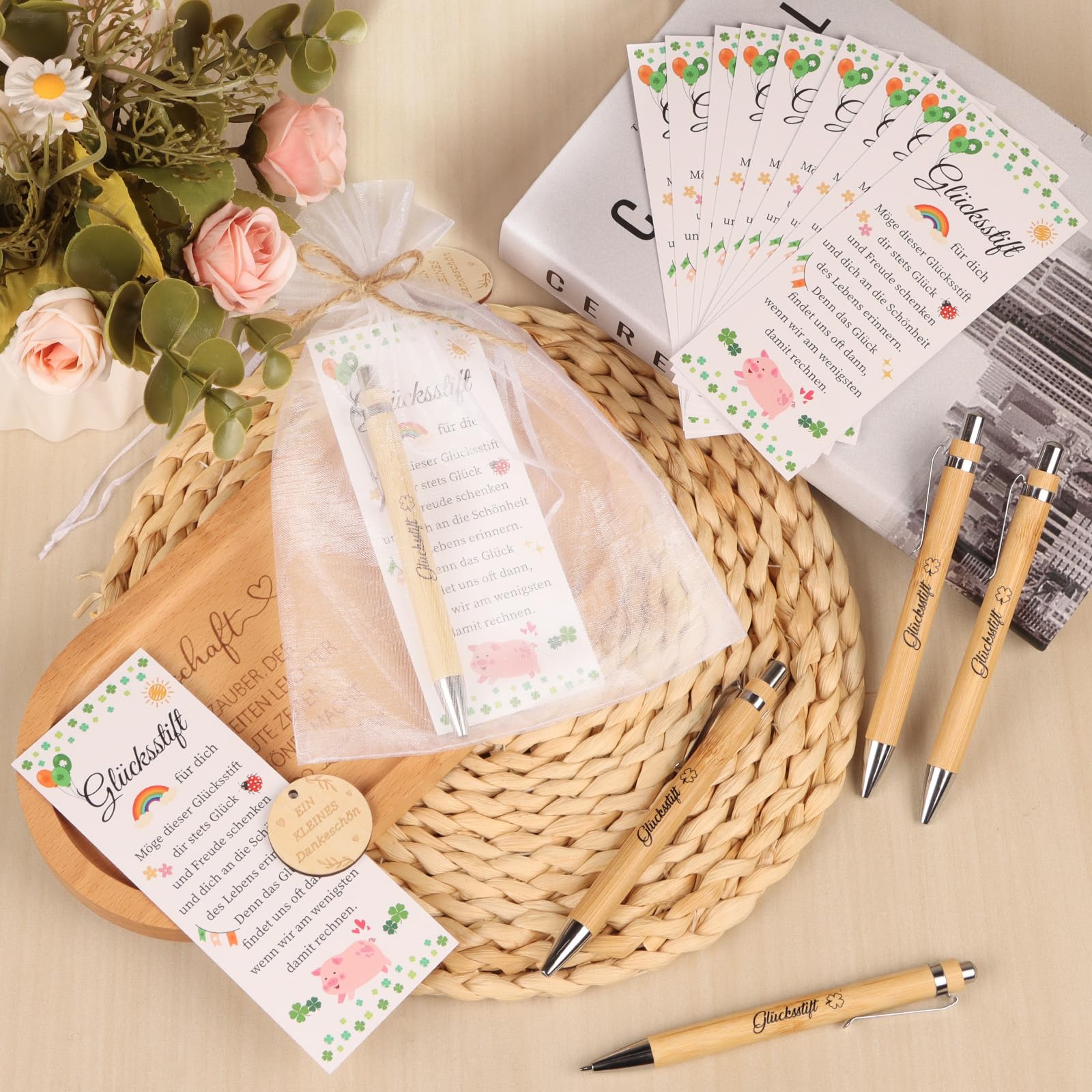 Das perfekte Geschenk für besondere Anlässe! Dieses Set enthält 26 hochwertige Glücksstifte mit Holzgravur, dazu Karten, Organzabeutel, Holzanhänger und Schnüre. Jeder Stift trägt die Aufschrift 'Glücksstift' und ist aus nachhaltigem Holz gefertigt - umweltfreundlich und wiederverwendbar. Die beiliegenden Karten mit dem Spruch 'Glücksstift für dich' übermitteln herzliche Wünsche und machen das Geschenk persönlich. Einfach zusammenzubauen: Schnur durch die Karte fädeln, Stift und Anhänger befestigen und in den weißen Organzabeutel packen. Ideal als Abschiedsgeschenk für Kollegen, Dankeschön für Lehrer oder Erzieherinnen, zur Verabschiedung in den Ruhestand oder für Team-Events. Die Stifte schreiben flüssig und liegen angenehm in der Hand. Ein praktisches und doch emotionales Geschenk, das lange in Erinnerung bleibt und täglich verwendet werden kann. Perfekt fürs Büro, die Schule oder einfach als kleine Aufmerksamkeit zwischendurch!