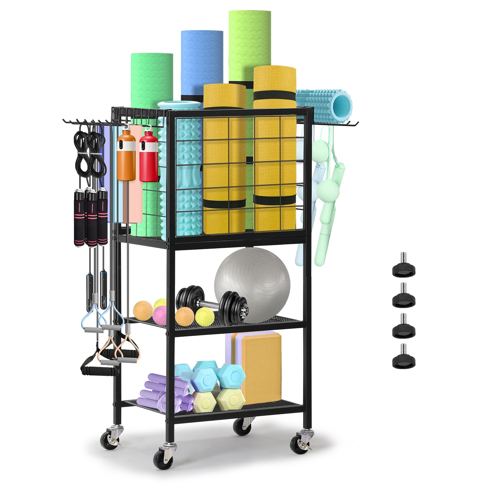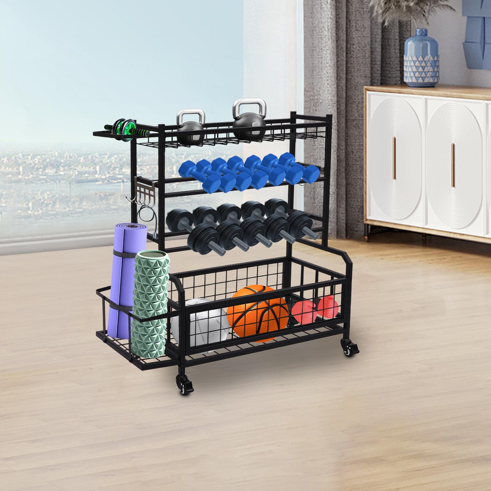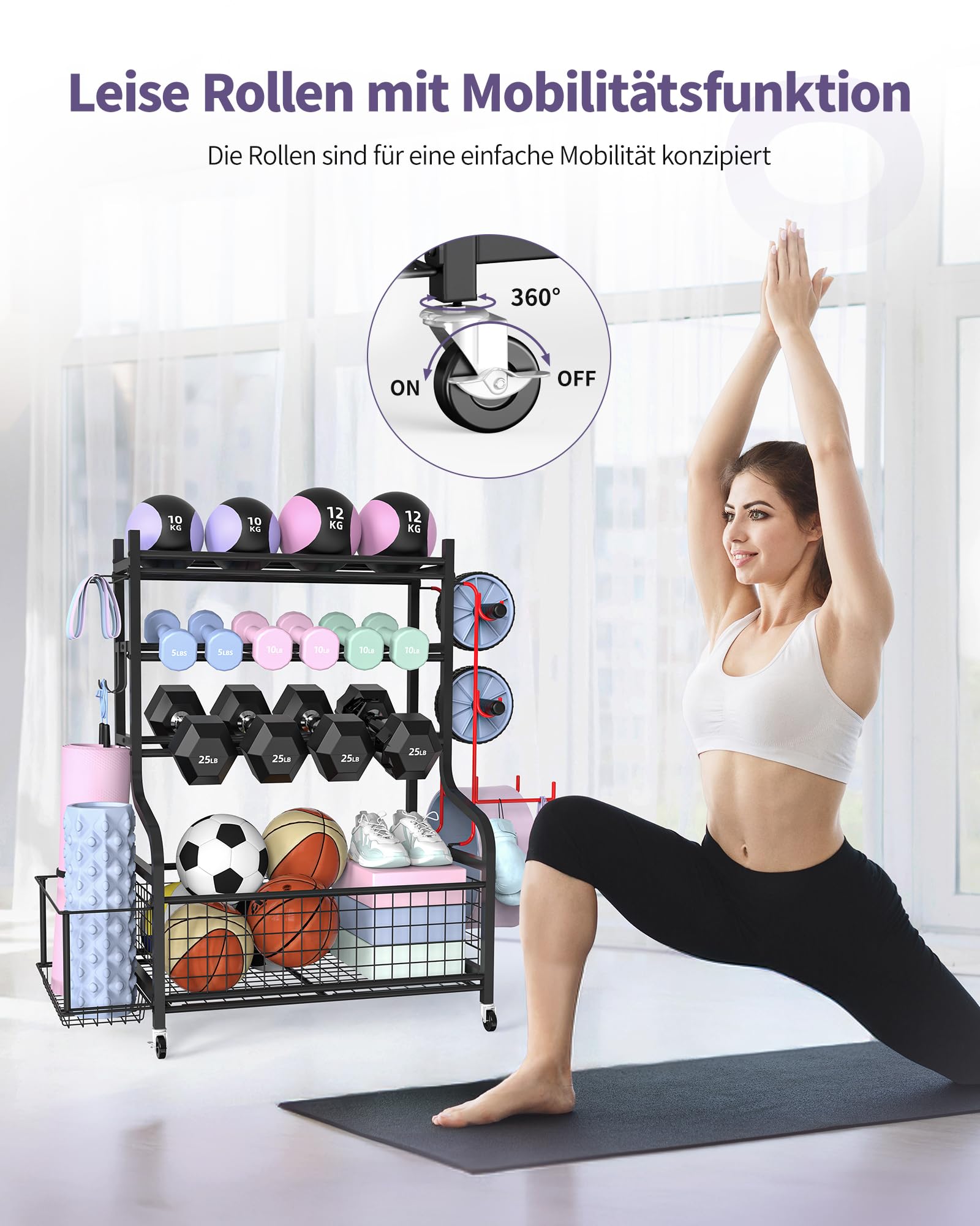 Endlich Ordnung im Homegym! Dieser robuste Hantelständer bringt System in dein Training. Mit 4 praktischen Etagen hast du Platz für all deine Gewichte: Kurzhanteln, Kettlebells, Yogamatten, Faszienrollen - alles findet seinen Platz. Die 4 Räder mit Bremsen sind der absolute Gamechanger! Einfach zum gewünschten Platz rollen, Bremsen fest und los trainieren. Aus stabilem Stahl gebaut, hält das Teil bis zu 300 kg aus - da kannst du getrost auch die schwersten Hanteln draufpacken. Besonders praktisch: Die seitlichen Körbe und Haken für Springseile. So hast du alles griffbereit und musst nicht lange suchen. Perfekt fürs Fitnessstudio, Yogastudio oder die Garage. Einfach montieren und sofort nutzen - dein neuer Ordnungsheld wartet!