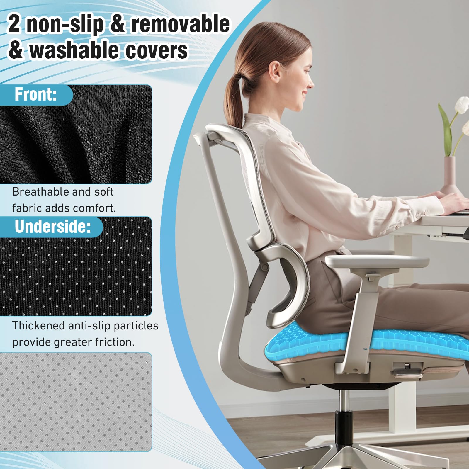 Endlich bequem sitzen! Dieses Gel-Sitzkissen mit Wabenstruktur verteilt dein Körpergewicht optimal und entlastet Wirbelsäule und Steißbein. Besonders gut bei Rückenschmerzen, Ischias oder nach längerem Sitzen. Der Bezug ist rutschfest und hat praktische Tragegriffe. Mit zwei austauschbaren Bezügen (schwarz/grau) - einfach waschbar. Das Gel-Material ist superweich, aber verformt sich nicht. Für Bürostuhl, Auto, Rollstuhl oder Sofa. Luftdurchlässige Struktur sorgt für Frische auch bei langem Sitzen. Einfach hinlegen und wohlfühlen!