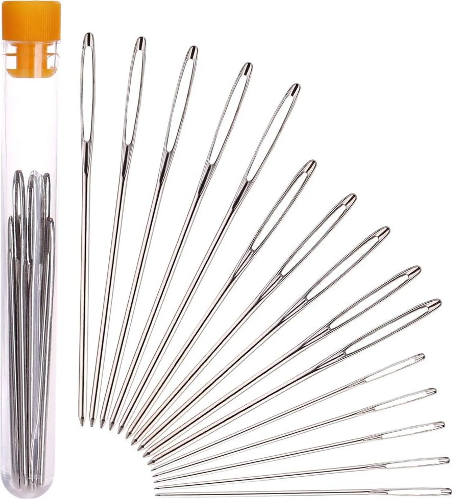 Nichts ist nerviger als Nadeln, bei denen man den Faden kaum durchs Öhr bekommt? Mit diesem 12-teiligen Nähset gehört das Problem der Vergangenheit an! Alle Nadeln haben extra große Öhrer - selbst mit dickerem Garn oder Wollfaden klappt das Einfädeln problemlos. Im Set findest du verschiedene Größen und Typen: gerade Nadeln in groß, mittel und klein, bunte gebogene Nadeln und fünf verschiedene Längen von 4,2 bis 6 cm. So bist du für alle Nähprojekte bestens ausgestattet. Die Nadeln sind aus hochwertigem Edelstahl, rosten nicht und gleiten super leicht durch den Stoff. Ob du normale Stoffe nähst, Jeans reparierst oder sogar Leder bearbeitest - mit diesen Nadeln wird's was! Die gebogenen Nadeln sind übrigens perfekt zum Stopfen oder für schwierigere Stellen. Alles kommt in einer praktischen Aufbewahrungsdose, damit keine Nadel verloren geht. Super für unterwegs oder um Ordnung im Nähkästchen zu halten. Ein Must-have für alle, die gerne nähen, ob Anfänger oder Profi. Damit macht Handarbeit gleich doppelt Spaß!