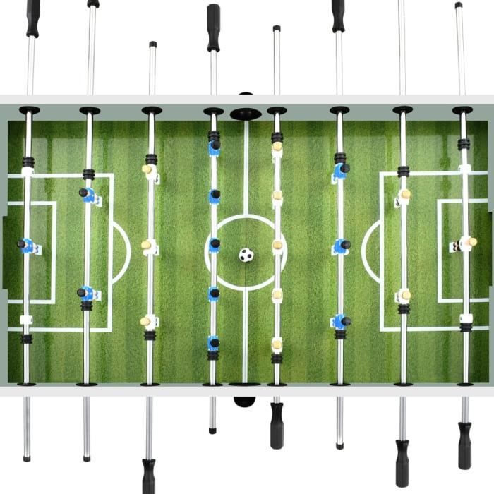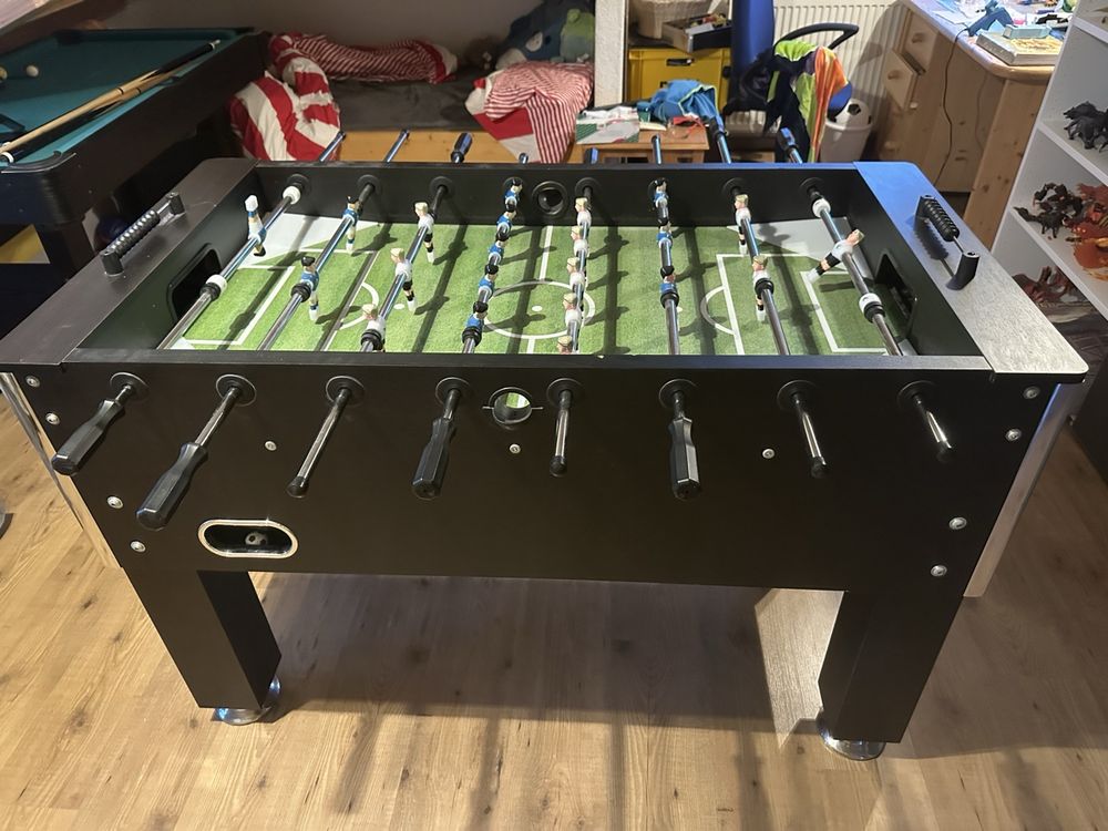 Lust auf eine Runde Tischfußball? Der INLIFE Kickertisch bringt Turnier-Feeling direkt in dein Zuhause! Mit 140 x 74,5 x 87,5 cm hat er die offizielle Turnier-Größe und wiegt stolze 60 kg - der steht bombenfest! Aus robustem MDF und Stahl gefertigt, hält er auch intensiven Spielen stand. Die 15,8 mm verchromten Stahl-Hohlstäbe mit Kugellagern laufen super smooth, die rutschfesten Griffe geben dir perfekten Halt. Das coole Feature: Die Beine sind höhenverstellbar, sodass du den Tisch ideal an deine Größe anpassen kannst. Im Lieferumfang ist alles dabei - 2 Tore, Fußbälle, Spielstand-Anzeigen, 8 Spielerstangen und 22 Spieler. Der Zusammenbau ist total einfach, auch für Nicht-Handwerker. Perfekt für Partys, Spieleabende oder einfach für zwischendurch. Egal ob alleine, zu zweit oder in der Gruppe - mit diesem Kickertisch kommt garantiert Stimmung auf! Ab 6 Jahren geeignet, also auch super für Familien. Auf die Plätze, fertig, kicken!