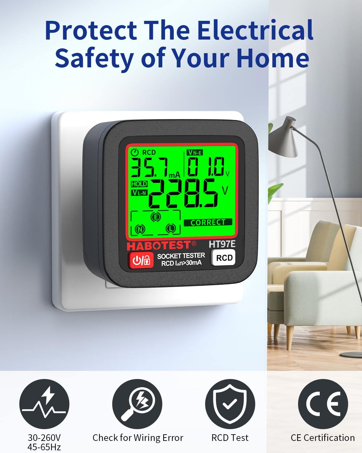 Sicherheit geht vor! Mit diesem professionellen Steckdosentester checkst du im Handumdrehen deine Steckdosen. Einfach einstecken und das LCD-Display zeigt sofort an, ob alles korrekt verdrahtet ist. Der RCD-Test prüft deinen FI-Schutzschalter - einfach Taste 2-3 Sekunden drücken. Misst Phasenspannung (L-N) und Leckspannung (N-E) im Bereich 30-260V/45-65Hz. Besonders praktisch: Nach 3 Sekunden sperrt sich die Anzeige für klare Ablesung und nach 5 Minuten schaltet sich das Gerät automatisch ab. Super einfach zu bedienen, auch für Laien - einfach Batterien rein und los geht's! Perfekt für den Hausgebrauch, um die Sicherheit deiner Elektroinstallation zu überprüfen. Sechs verschiedene Fehlerdiagnosen geben dir volle Kontrolle über deine Steckdosen. Mit EU-Standardstecker für kompatiblen Einsatz. Ein unverzichtbares Tool für jedes Zuhause!