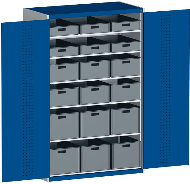 Dieser Schrägboden-Regalwagen ist ein echter Alleskönner für Werkstatt, Lager oder Verkauf! Mit den Maßen 105x50x169cm und 6 Ebenen bietet er richtig viel Stauraum. \\n\\nKomplett mit 18 blauen Euroboxen 40x30x12cm - perfekt für Teile, Werkzeug oder Waren. Die Boxen sind spülmaschinenfest, chemikalienbeständig und halten von -20°C bis +80°C aus. \\n\\nDie 15mm starken Schichtholz-Böden tragen je 50kg, insgesamt bis zu 250kg! Die blaue Stahlkonstruktion ist kunststoffbeschichtet und damit super robust. \\n\\nMit 4 Lenkrollen - davon 2 mit Feststellbremse für sicheren Stand. Die Gummiräder sind leise und laufen super leicht. \\n\\nOberkante der untersten Ebene bei 160mm - gut erreichbar. Ideal zum Kommissionieren, Transportieren oder als mobiles Regal. Ein Arbeitsgerät das im Betriebsalltag absolut überzeugt!